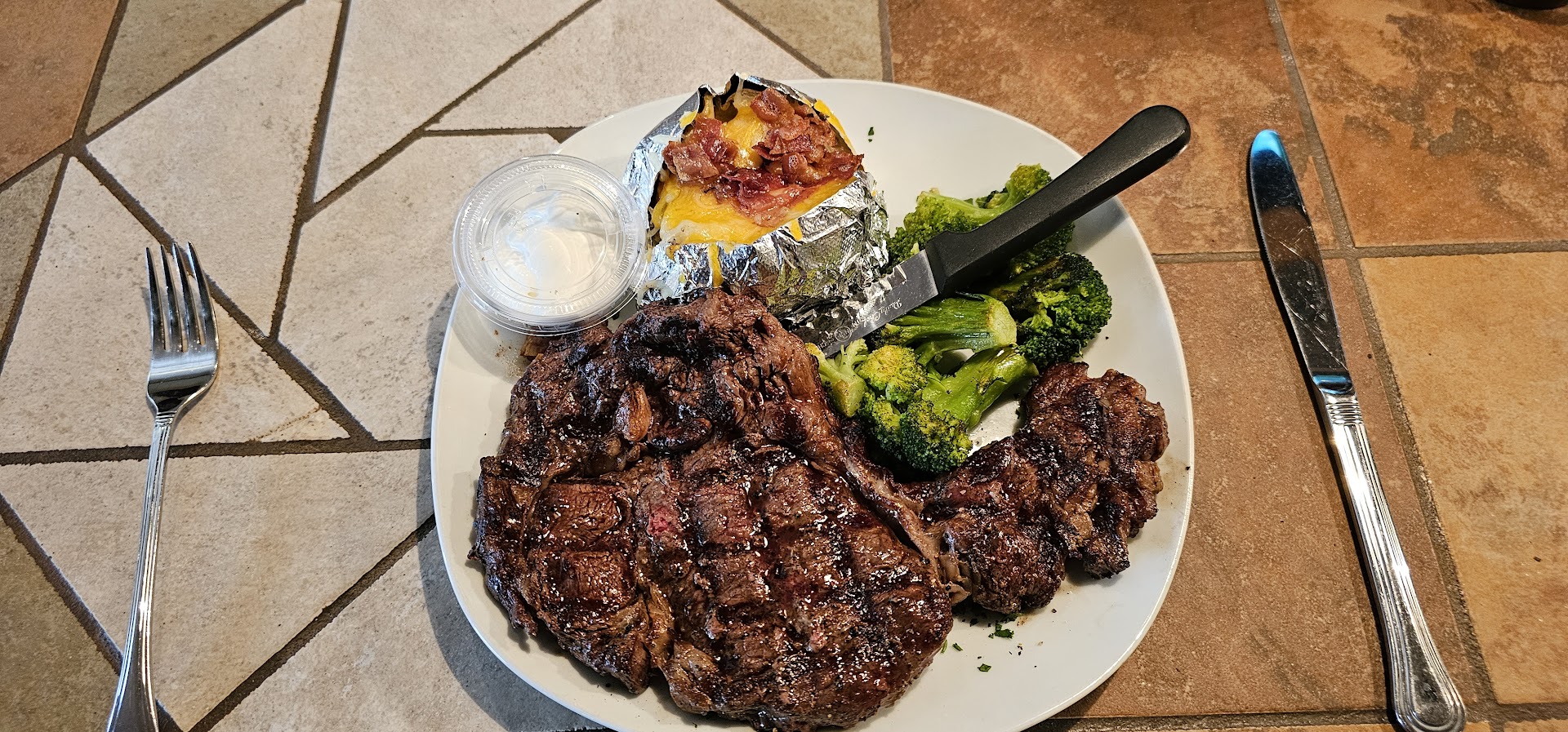 Read moreFood was good! But not much for potatoes. Got a child size portion of cut fries to go with the Rib Eye Steak, and a portoin of smashed potato with the Smoked Pork Loin that felt like half a small baked potato. But we left full! The smoked pork loin was good, but supposed to be marinated with Peach Bourbon or have a Peach Bourbon sauce. No hint of that on the loin, but was not dry. Steak you could cut with a fork and good flavor. Appetizer of Artichoke Dip was also good! Waiter was very prompt and observed when we needed a drink refill. Food came pretty fast, considering it was a sit-down and relax kind of place. We would go there...