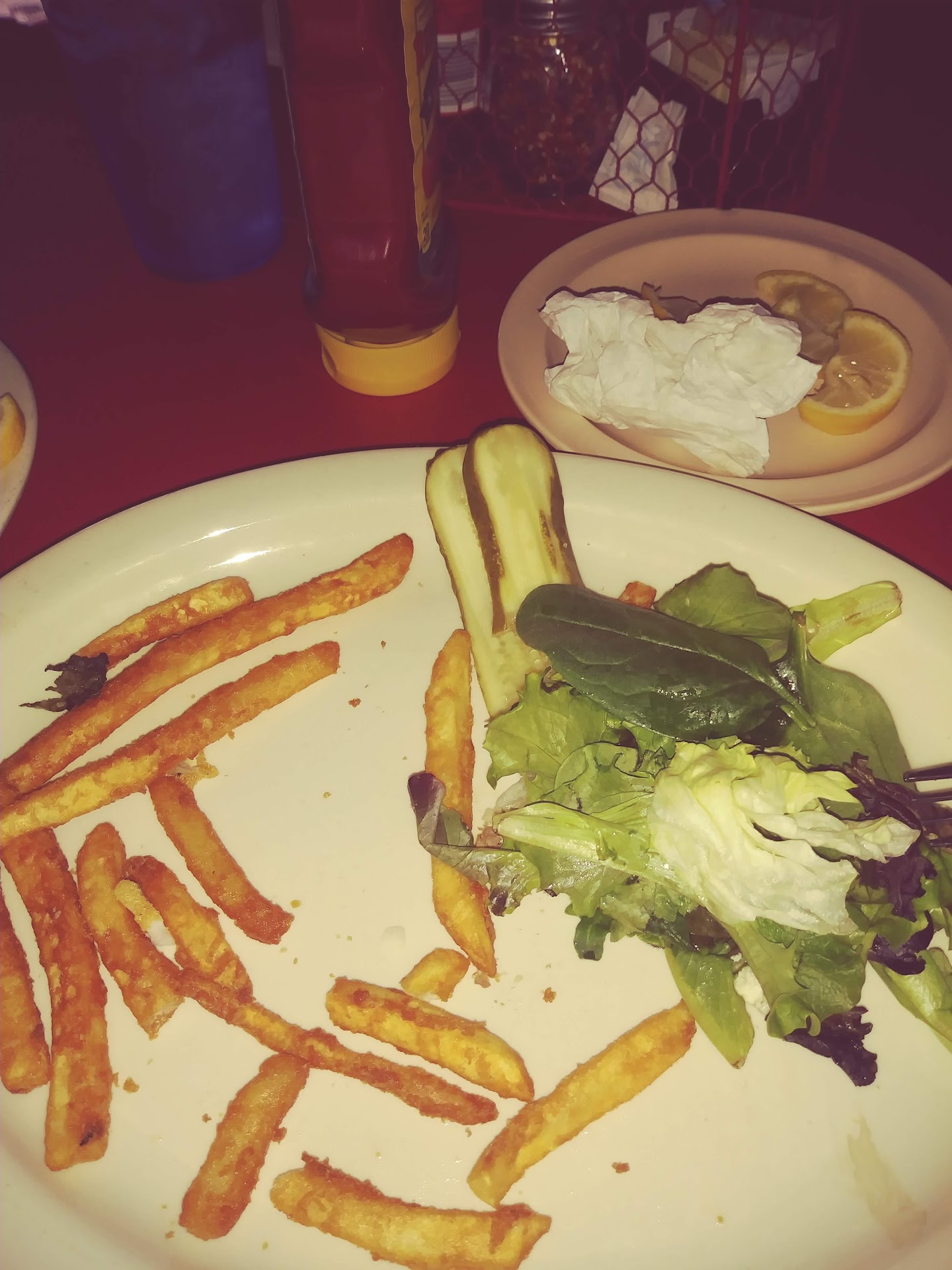 Our first time here. It looks cool. Cozy dim lit little joint. Good music playing. The band is setting up for later tonight. Waitress says we can sit anywhere we'd like so we did just that. She comes over. Asks what we want to drink and says she forgot the menus and would be back shortly. We waited. After 5 minutes or so she came back with drinks...& no menu. Oh..she forgot...then grabbed 2 menus off the bar that wasn't 3 feet away from us. She then asked if we needed more time...uh yes you JUST handed us the menu. She waited way too long to come back maybe 10-15 minutes. We then wait another 28 minutes for them to bring our food. We ordered the catfish plate and the blue burger. The catfish came WITHOUT my hushpuppies and guess what WE ARE OUT OF TARTAR SAUCE ... What? Yep we sell fish but are out of tartar sauce. What else can I get for you guys? My hushpuppies. Coleslaw is no bueno. The fries were good. When we finished eating we finally had to go hunt down the ONE waitress working the lunch rush on Friday and tell her we were done. She runs back with the check. So I said it...yes. I did that. I asked her once again when I was going to get my hushpuppies .. She said I told him to cook those. Then I asked if I had to pay for my whole meal since I didn't get it and she went to talk to the man at the bar (manager/owner) I figured. We did get a discount but we won't be back here again. Oh yeah and the lemons are so old they are dry..no juice at all came out. Very disappointing. If that was the manager he should have came...