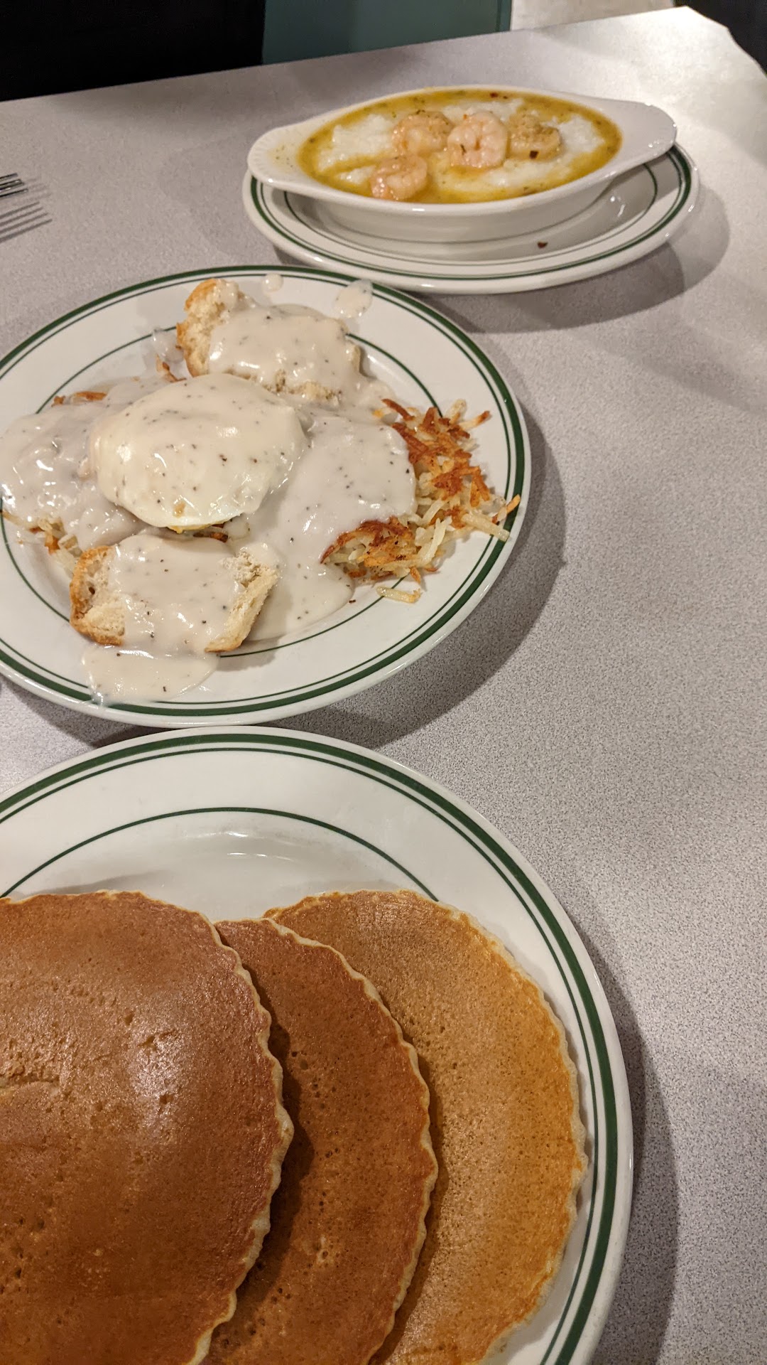 We tried to biscuits and gravy. I'm a huge fan of biscuits, but to eat this one, I had to take a knife and fork to it. Pretty overdone. The biscuits for free at Comfort Inn up the road we're better. I'm not trying to be insulting, just honest. The gravy was a pretty typical sausage gravy. Wondering if hash browns are made in house..not sure. They were good.
