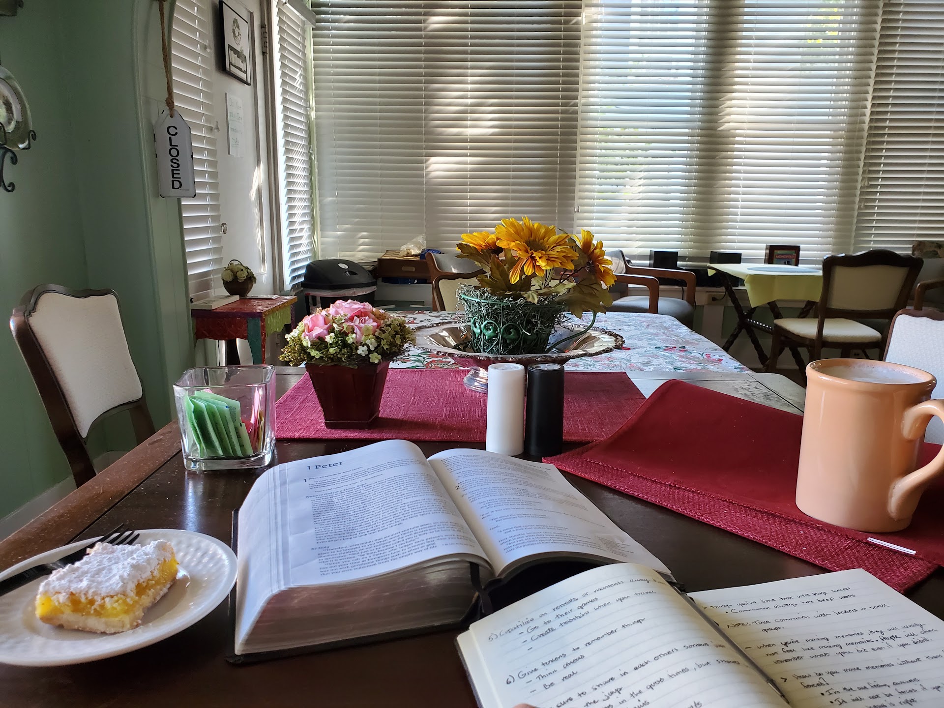 Service was great and attentive, even checking on me and offering to turn lights on, take my plate, and charged me half-price for my lemon bar since he said, "it's smaller than they normally are". Foot traffic increased after I was there about an hour studying and I heard mostly praises about the food from tables around me. I would say this is less a coffee shop and more of a cafe/brunch style place. The house is inviting and there is an outside porch with seating. It was a good place to sit for awhile.