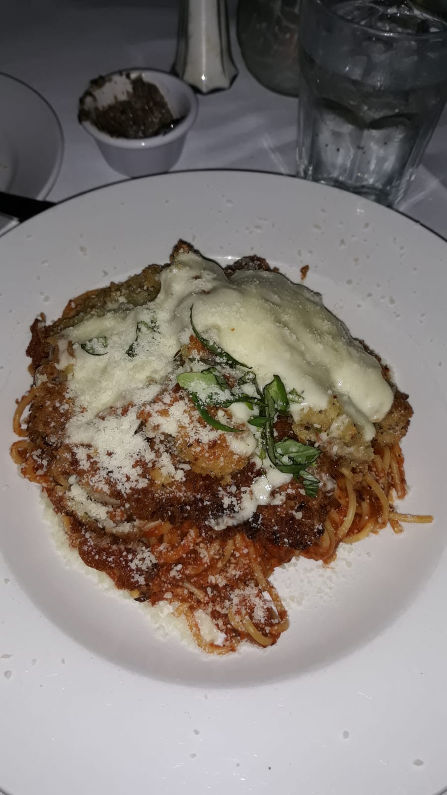 The food was extremely unimpressive. I ordered penne in vodka sauce (one of the cheapest entrees at $23.) Completely unremarkable; indeed, it was too salty and almost 100% pasta and sauce, with not even a few cheap vegetables thrown in to break the monotony, save a tiny amount of onion and parsley. Again, scandalously expensive for what you get, a mere bowl of noodles. My wife ordered veal scallopini, at a whopping $38. It came with a bed of spaghetti and tomato sauce, and it was all rather bland.