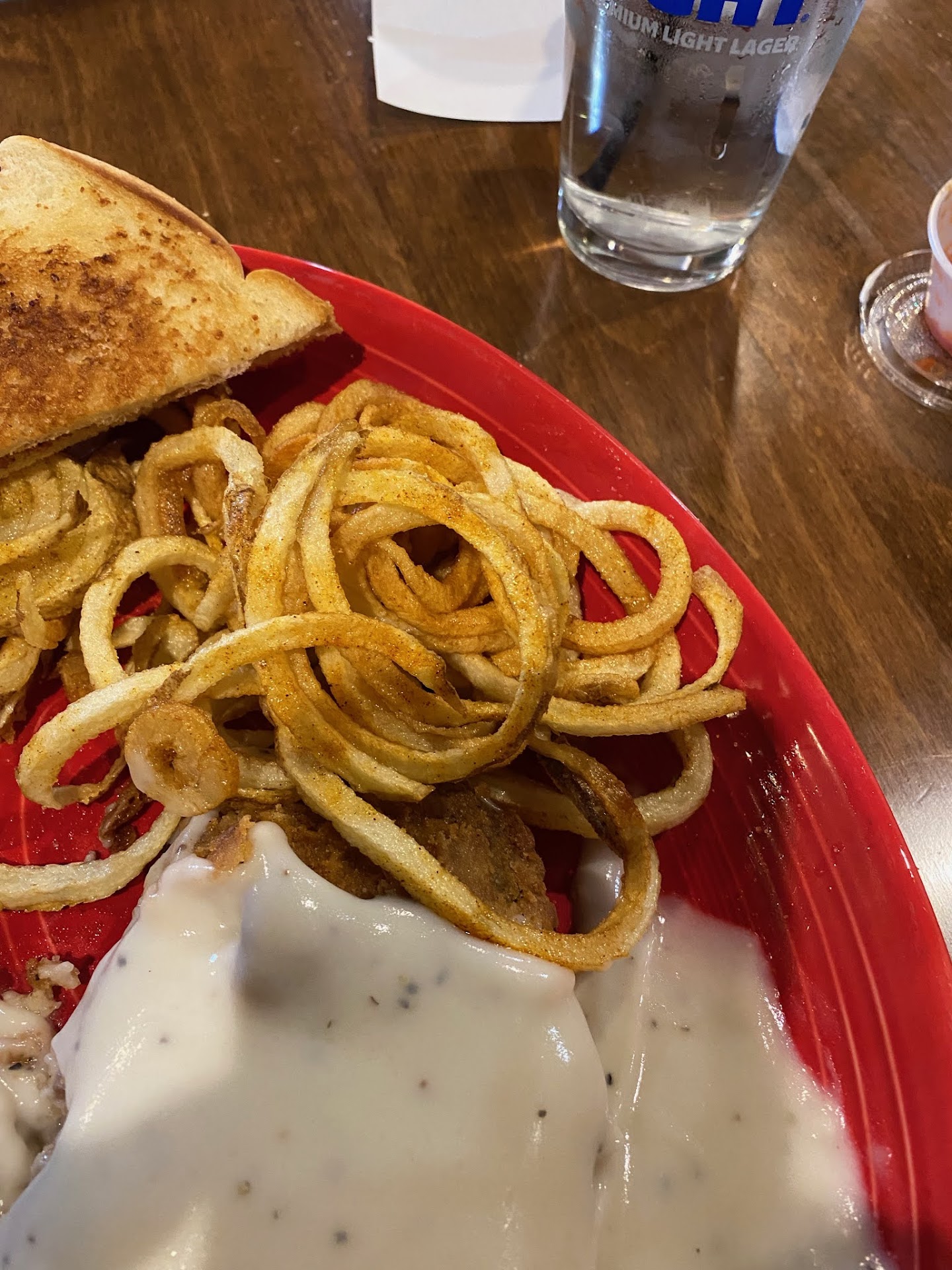 My two cohorts kept it simple for all party's involved and ordered the chicken strips. I guess I was the trouble maker and ordered the crispy chicken salad with no tomatoes. I even tried to take an item away to make the salad construction easier. Well I get my salad with just a few wilted and brown pieces I can discard these with minimal effort, the main problem was not only the amount of onions but the fact onions were invading my semi edible salad in the first place.