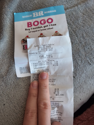 my partner and i go to baskin robbins because we have a bogo sundae coupon. we're excited. we get in the drive thru and see that they have these items under the sundae menu (the one that says sundae) called creature creations. we get even more excited. i get the wizard because it's the coolest one. my partner gets the second coolest one (dragon) because i got there first, you snooze you lose. we get to the window and the cashier, BAILEY, looks at our coupon and flatly says "creature creations aren't sundaes". this was immediately followed by a demanding "$10.58". i cannot convey the tone through text but i can promise you it was fairly rude. at that point i'm bewildered. bailey stunlocked my brain and the only thing i was capable of doing was handing over the debit card. she starts to hand out our SUNDAES and little paper crowns, i'm excited again. nothing good can last at this baskin robins, though. we get a pristine looking dragon crown and one elf themed crown that is already sized for a small head and stained with coffee. if i could bet, i would say that hat was on a child before it got to me. gross. needless to say this absolutely harshed my vibe, so much so that we had to note bailey's name down from the reciept. when attempting to call the store, nobody picked up and we were sent to a voicemail box that was not set up. i just want to hear her say sorry. until then, we're a dairy queen household.