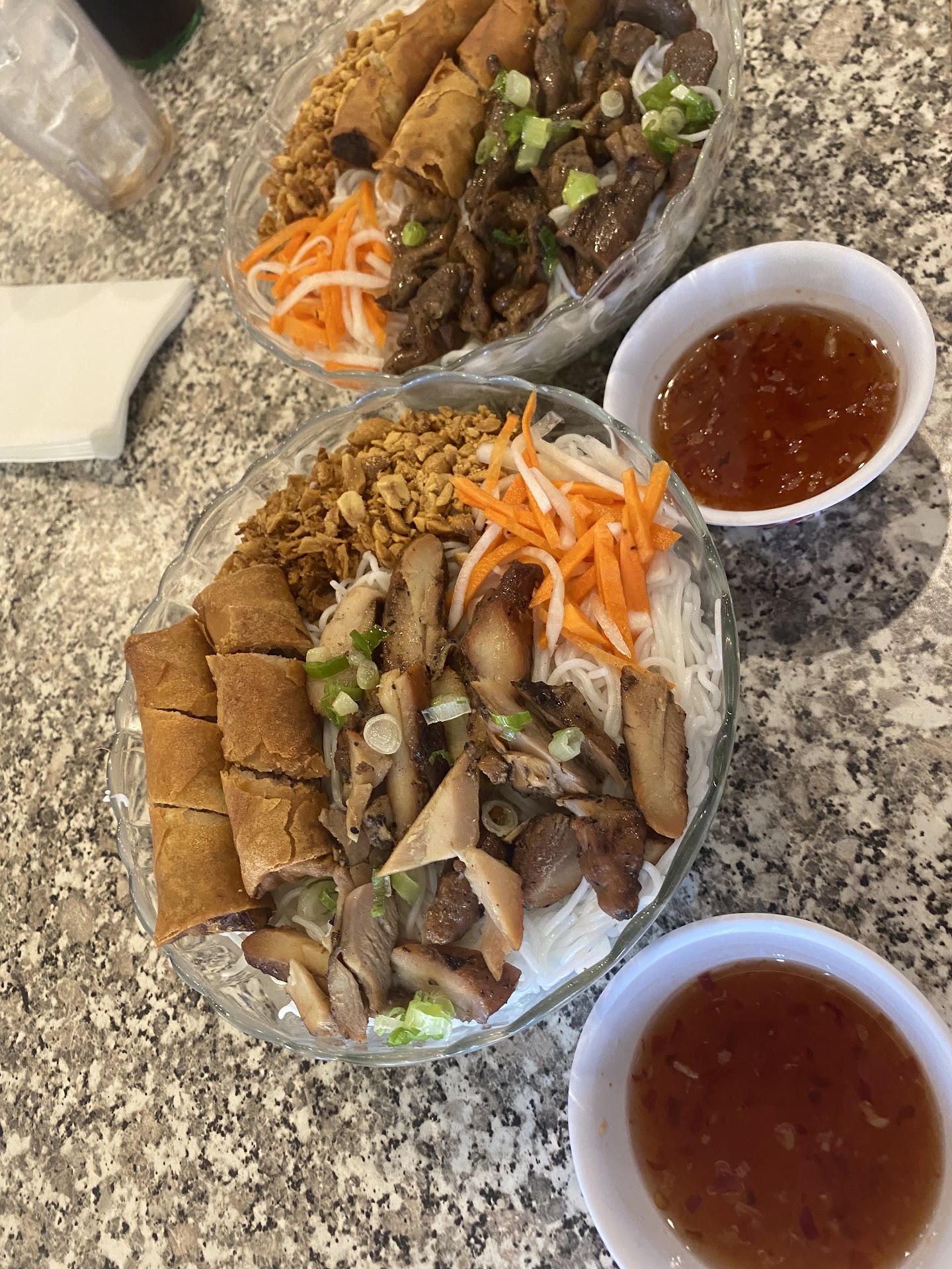 Read moreThe outside is very deceiving. We were cautious to walk in it was actually incredibly clean and the staff was attentive and welcoming. THE FOOD IS AMAZING! We started off with two egg rolls and those were okay but the real money maker was the Bun Ga Nuong which is rice vermicelli noodles with grilled chicken on a bed of fresh chopped vegetables. The veggies were fresh, crispy, and vibrant! My boyfriend had the same but with grilled pork and he enjoyed it as well. The serving size is huge! We both has left overs. We will definitely be...