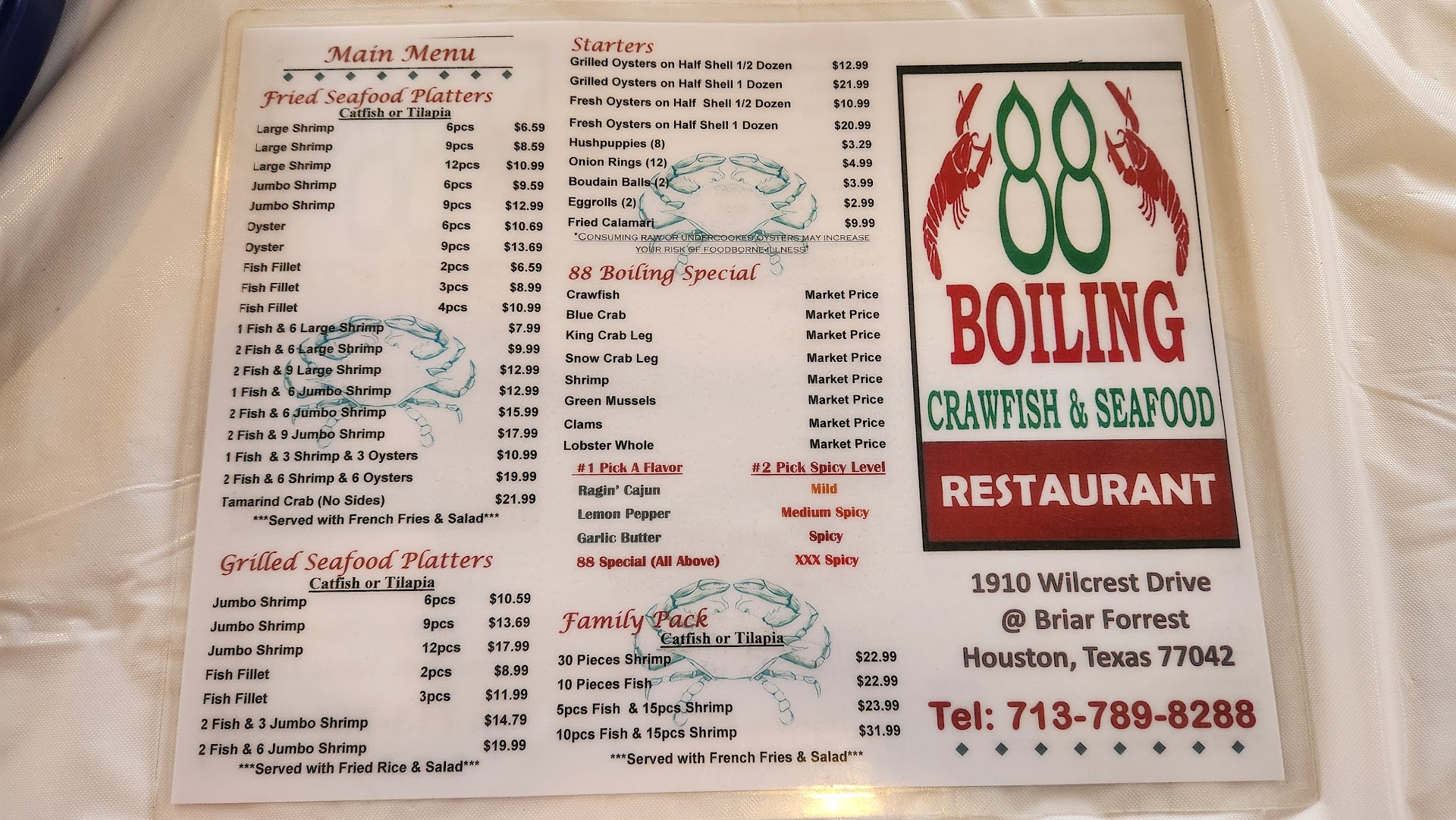 We had 5 pounds of 88 special flavor boiled crawfish, between the group. It is NOT your regular cajun crawfish. Extremely oily and heavy on the garlic. I have been eating crawdad's my whole life and I have never tasted anything like it. That is not to say we did not enjoy it- it was pretty tasty, actually, going down. Just very oily.... like a marinade instead of a boil. If you are looking for a good-ol-cajun-boy style crawfish- keep it moving!