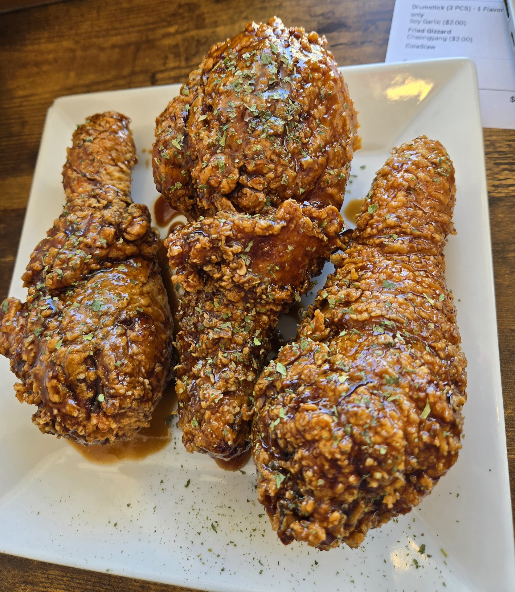 Read moreAmong the best Korean Fried Chicken in Houston, and with that variety, price and portion they are really worth the bang for your buck! I got the chicken gizzard with the cheongyang sauce - highly recommend this for anyone who wants something creamy, sweet & a little sour with a kick! It's super addictive, and the staff let me try the sauce before ordering. The chicken gizzard still stays crunchy and not overcooked or overly chewy. The portion is crazy (see pic below for my 8.5 dollars/3 drum sticks, I only finished 1 because they were so big), and everything remains super juicy (it was wonderfully crispy & dripping juice that king of juicy when it first came out) crispy and there is still some crunch after being carried around for 8 hours by me in a box. Their soy-garlic is smoky and has a little kick which makes them rival BBQ. I saw that they have a lunch combo and that's a lot of food for the cost! The staff is SUPER nice - like some of the nicest staff I have met. They are super honest too - they did tell me that food would be out in about 20 minutes as they freshly cooked them (I think I got the chicken gizzard quite early in actually). It has a cute interior too and not too loud music. Y'all better keep this spot open and busy because it was not full when I got there on a Saturday late lunch and...
