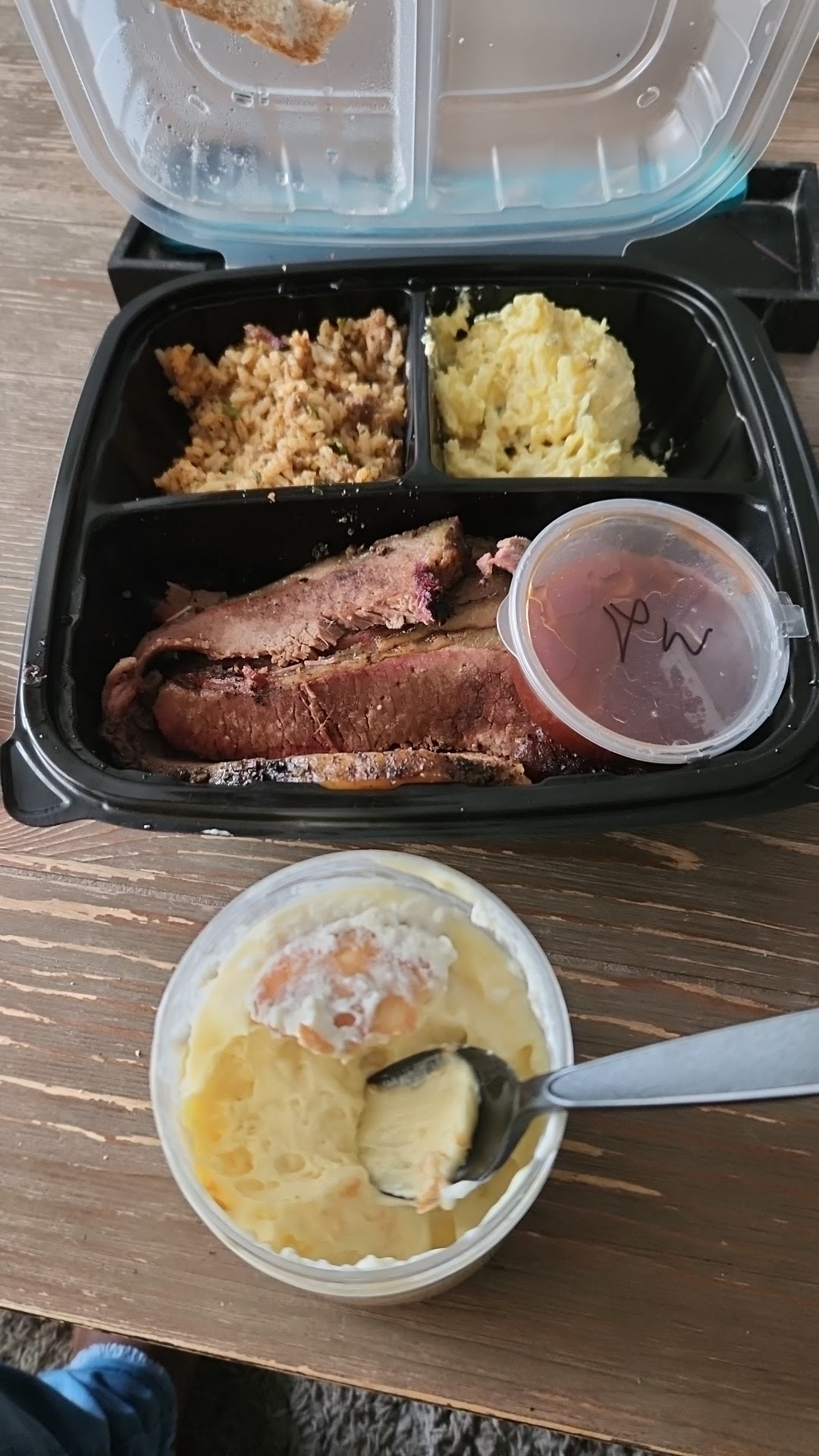 Read moreBrisket with peach whiskey sauce, SPICY dirty rice, and potato salad. Great and welcoming customer service. They do not skimp on the spice. The banana pudding...soooooo good. Everything tasted great, but the banana...