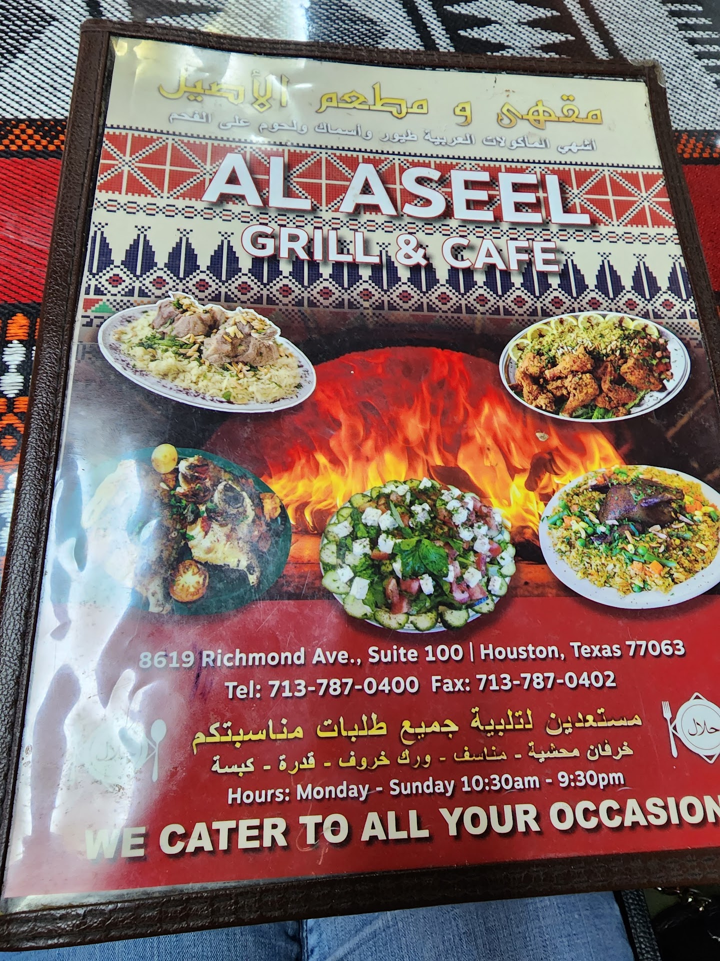 One of the better Middle Eastern restaurant to try if you are into the food. Location is on Richmond and Dunlavy on the corner of the strip mall. It is a hole in the wall place but don't let it fool you. The waitress was welcoming and nice. She spoke English well but limited understanding. Here was what we decided to order besides soda and water (lol) and naan was on the house (came with spicy pepper salsa and tangy yogurt for dipping; love the kick of the pepper)): Hummus with meat - so good. The seasoning of the meat complemented the hummus so well that we couldn't stop picking at it. It was salted perfectly and add a bit of the pepper salsa if you dare (I recommend doing it) Falafel - ordered 4 since there were 4 of us. The dish came with 3 dipping sides: hummus with chunky chick peas (so good), creamy tahini sauce (slightly bitter, did not enjoy too much) and a creamy eggplant sauce (ok but added a little too much tahini which had a bitter after taste) the falafel was one of the best I tasted since it was not overcooked or dry like I had before. If you like chick peas this is for you Whole fried chicken - chopped up whole fried chicken on a plate of basmati rice and a side cucumbersalad. The food came out piping hot and depending whether you like dark or white meat, I recommend dark meat as the chicken was so moist and juicy. The breading on the chicken was thin but crispy and seasoned very well. I wouldn't mind ordering a bucket of dark meat to go. The breast was dry but we ate everything which meant yummo! Al Aseel Mixed Grill for 5 - this came with all assortment of meats: lamb chops, chicken, beef chunks and kabobs. The smell of charcoal was present so you know that you get this additional essence cooked into the meat. This also came on a large plate of rice with salad. The only meat I liked was lamb as it came out tender and the flavor was on par. The other meats especially the kabobs were overcooked until it was dry. The rice was a good addition and flavored well but it was way too much. Overall I had a good experience and it was different as I don't eat this type of food too often. I will come back and order the fried chicken and hummus with...