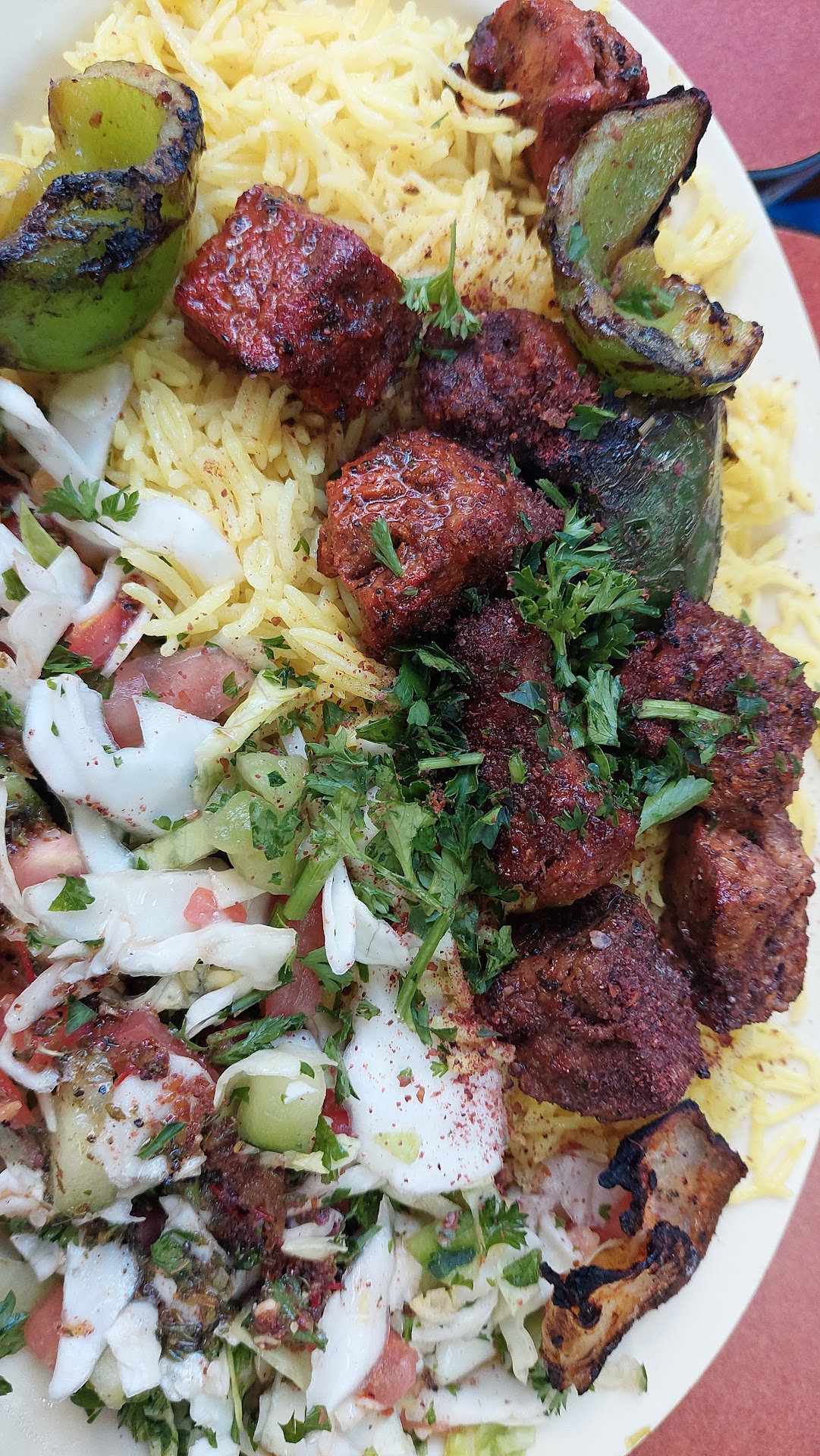 I have changed my review from 5-stars down to 3-stars. There is a simple reason. About a month ago we had a full-grilled chicken (take out) and yesterday I had a half-grilled chicken inside. Both of these had the same problem: More than half the breast meat had been removed from the breast quarters before cooking. From my perspective, that is not an acceptable option and warrent a 1-star review. Even though the grilled chicken is excellent, these two experiences means you have lost my business. Previous review: We ordered the lamb kebab and the half grilled chicken. Both dishes were perfectly spiced and not salty. The cabbage salad and rice balanced both dishes nicely. The lamb was ordered medium and was cooked perfectly. The grilled chicken was some of the best I've eaten, and leftovers were finished the next day! Friendly service and nice atmosphere. We will be back.