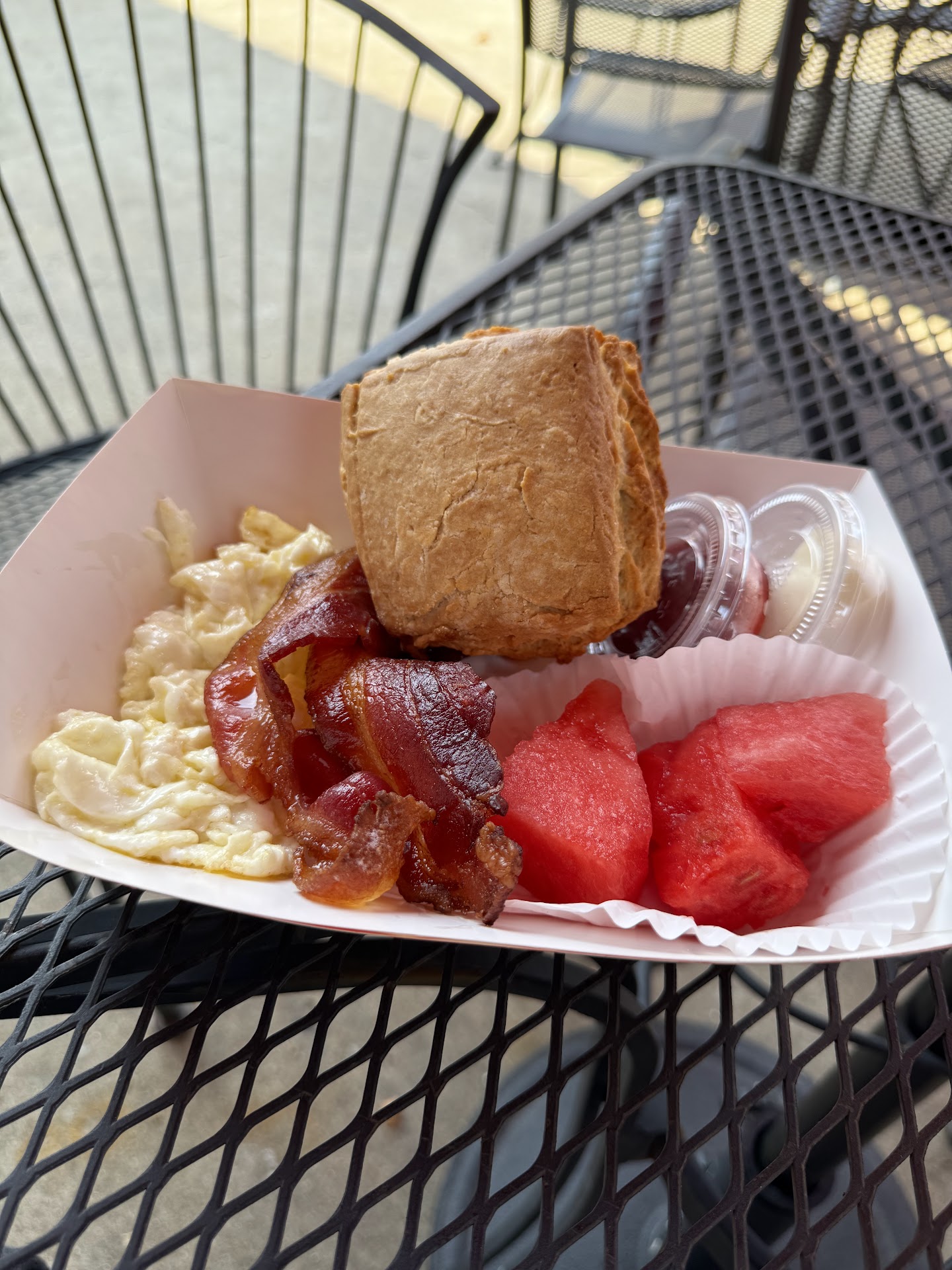 Read more👍 The breakfast sandwiches here are great, with options on either croissant or biscuit. 👍 My friends love the croissants, but I’ve never liked them—they’re too crumbly and messy to eat. 👎 We requested our food to-go since we were bringing breakfast for a friend. Unfortunately, it came out without containers, and it took over 20 minutes to get one. ⚠️ Because of the delay, the sandwich was cold, and flies attacked it. 👍 The maple brown sugar latte is delicious. 🤜 There’s always a line, but it moves fast and the people-watching can be entertaining while you wait. 👍 The dining area has toy dinosaurs scattered around for kids to play with. 👎 The venue is mostly outdoors, and I didn’t see a water station when we arrived. I ended up getting tea from a nearby café, only to discover later there was water available. I found it rude that I was told they don't allow outside beverages, despite no sign posted, having to wait outside, and not noticing a water station until after standing in line. 👎 We were reminded of this again by the servers, which made us feel unwelcome... for trying to stay hydrated. 👎 On another visit, the server dropped my to-go buiscuit breakfast sandwhich and the fruitcup (with no lid) got fruit juices all over the sandwhich. It did not improve the flavor. I ended up having "second-breakfast," like a Hobbit,...