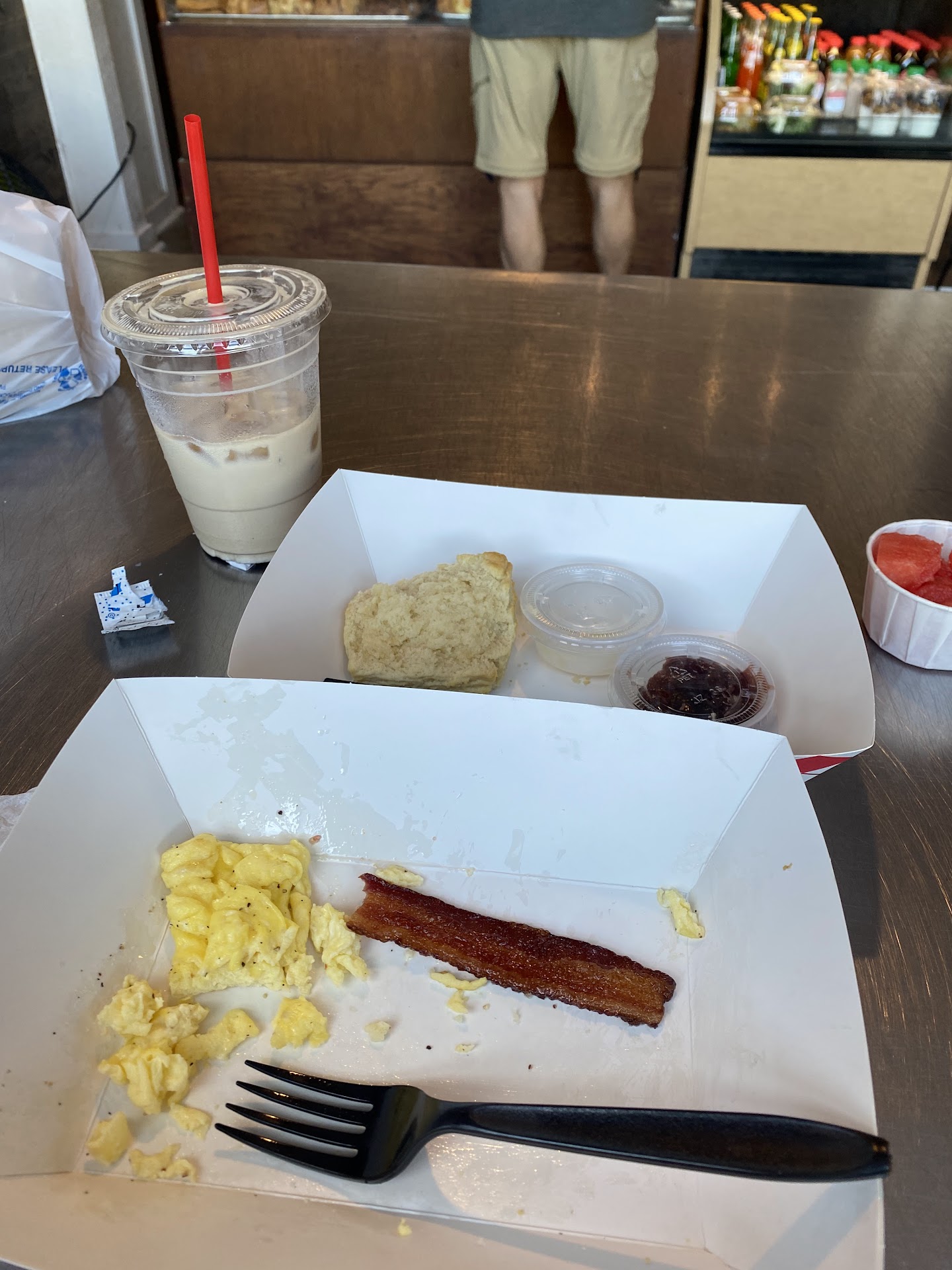 Read more👍 The breakfast sandwiches here are great, with options on either croissant or biscuit. 👍 My friends love the croissants, but I’ve never liked them—they’re too crumbly and messy to eat. 👎 We requested our food to-go since we were bringing breakfast for a friend. Unfortunately, it came out without containers, and it took over 20 minutes to get one. ⚠️ Because of the delay, the sandwich was cold, and flies attacked it. 👍 The maple brown sugar latte is delicious. 🤜 There’s always a line, but it moves fast and the people-watching can be entertaining while you wait. 👍 The dining area has toy dinosaurs scattered around for kids to play with. 👎 The venue is mostly outdoors, and I didn’t see a water station when we arrived. I ended up getting tea from a nearby café, only to discover later there was water available. I found it rude that I was told they don't allow outside beverages, despite no sign posted, having to wait outside, and not noticing a water station until after standing in line. 👎 We were reminded of this again by the servers, which made us feel unwelcome... for trying to stay hydrated. 👎 On another visit, the server dropped my to-go buiscuit breakfast sandwhich and the fruitcup (with no lid) got fruit juices all over the sandwhich. It did not improve the flavor. I ended up having "second-breakfast," like a Hobbit,...