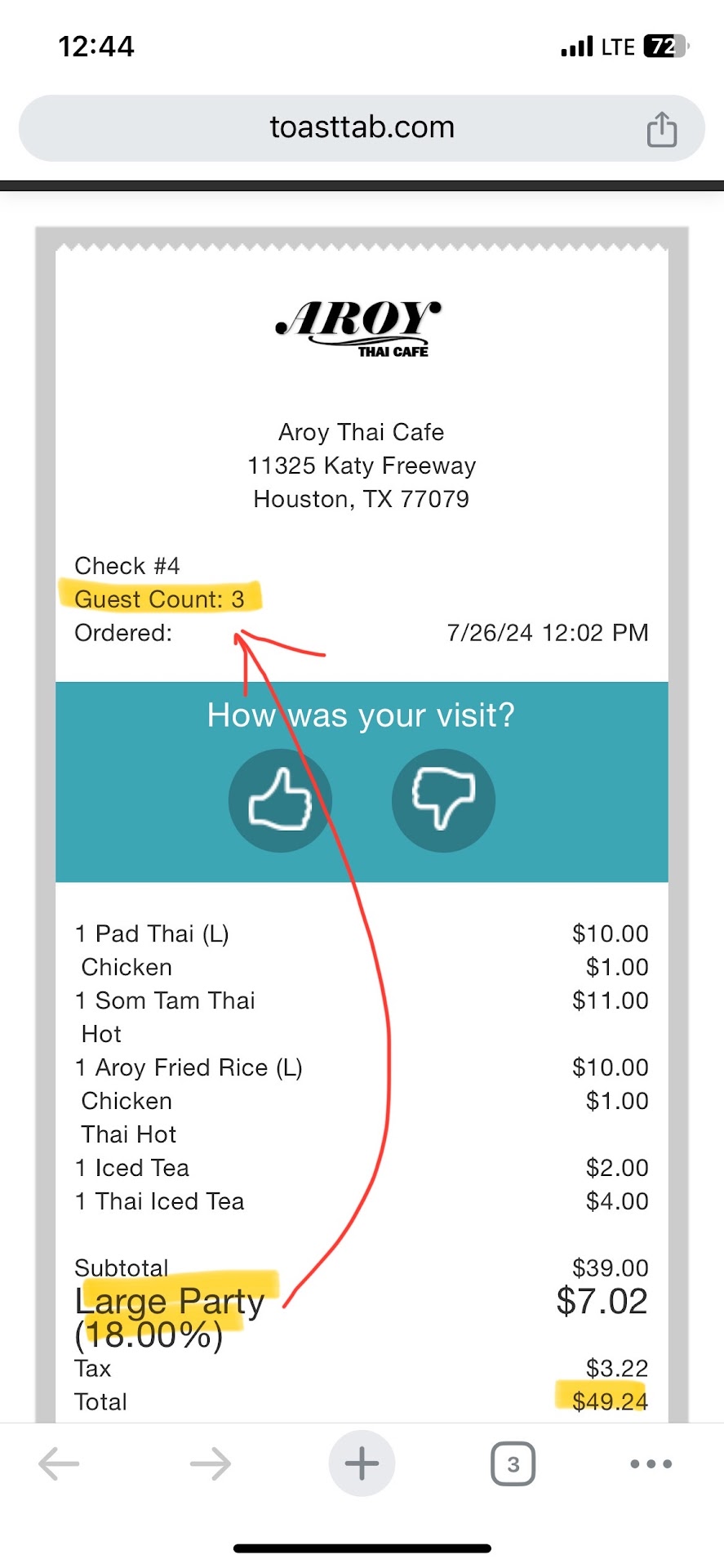 Our only issue was when they came with our total on one of those card swipe machines. We didnāt get to see an itemized receipt so when they gave us the total, it felt off to me. They did NOT let me know that tip was already included. I decided to click āno tipā and have the receipt text to me to check out why the cost was so high as I had cash on me in case I needed to leave cash tip. It was just my husband, our daughter, and myself. Somehow they neglected to tell me they auto added the large party gratuity on my check. I thought it...