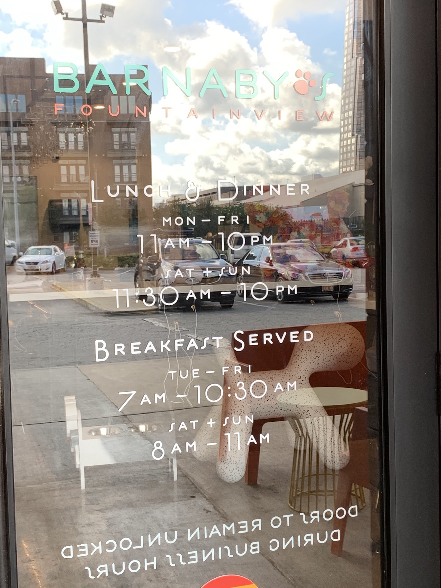 Read moreHave eaten at Barnaby’s many, many times on a weekly basis. Usually go to Woodway location and they are always on top of their game. Today, I decided to try the Fountainview location and honestly must say it’s a far cry from any Barnaby’s experience I have ever had. Walked in, stood there (waited and waited and waited) employees moving to and from cash registers collecting money no one even acknowledged, greeted or say a thing again waited more. Finally after what seemed like 15 minutes a group walks in and they are greeted and attended too (mind you I’m still standing here...Hello). I left took my business elsewhere but not after calling the manager to let him know what I just experienced. Come to find out the man that was at the register on several occasions and never once acknowledged was the manager. I explained to him about my experience and his excuse was because of the pandemic we don’t have enough staff to be able to attend to everything (excuse me, what). I suggested that maybe they should then limit the number of guests they are trying to serve so that their staffing levels are suffice to handle their workload. Furthermore, I get the pandemic issue by all means ain’t discounting the fact but the pandemic has nothing to do with customer service 101 and not acknowledging someone or saying hello or we will be right with you or anything is a lack of poor...