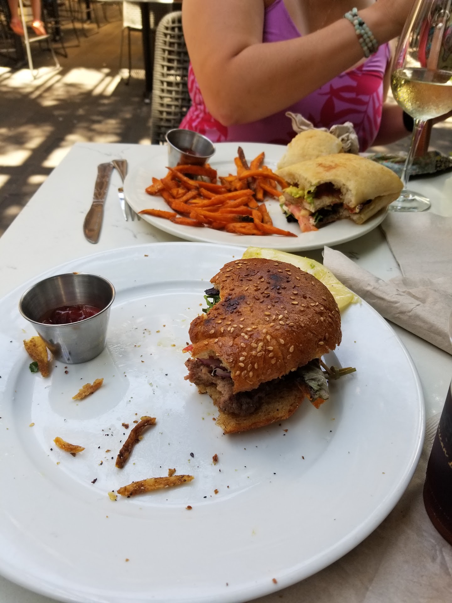 The food came out pretty fast. I ordered a medium rare buffalo burger with Swiss cheese and sweet potato fries came with it. My burger was juicy and cooked just right. It had all sorts of veggies. The sweet potato fries were really good. You can also choose regular fries if you want but I would recommend the sweet potato fries.