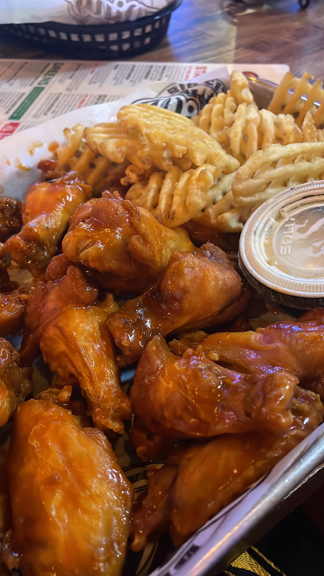 I think this is the location I ate at. Not 100% positive. There are very few times I post that I will probably not be back to any of their restaurants. I have been craving hot wings for a while and just not been able to make it happen. So this beautiful Sunday afternoon I decided to try this place instead of the Wing restaurant I usually go to which is right in the same neighborhood. The service was ok I guess. My food arrived quickly. But…. The wings were plain with a little, and I mean a little, sauce squirted in a zig zagged pattern across them. I could see sauce pooling underneath them. But not actually ON them. I’ve never had to toss my order before in a restaurant, have you? And it’s particularly hard on a flat surface compared to a bowl. So my server brought me some extra sauce. He didn’t offer to take them and toss them. Hmmm. So I poured that sauce on and tossed them one by one as I ate. The sauce, I ordered the medium heat, was so runny it would hardly stay on the wing and was weak/slightly watered down tasting. The same was true for the blue cheese dressing. Wouldn’t stay ON the wing. That made everything a challenge and a lot messier. I wondered why they had two ketchups on the table. The front label of the ketchup closest to me was facing away and I picked it up without thinking and squirted some out for my fries. It was NOT ketchup. Well, it was, except it was some kind of HOT PEPPER ketchup. I drank all of my Pepsi and my waiter never noticed. I also wish this Wings restaurant and others realized, and came up with a better solution, to the serving vessels of dressings specifically for wings. That little plastic container that we get with the meal? NOT IDEAL for dunking wings in any fashion. I may end up needing to eat at one of these restaurants again in the future, so that’s why I said will most likely not be back. I’ve had way better wings AND atmosphere at many other Wing restaurants. My meal cost $24 and change. I left $30. The next time I spend $30 on myself for a meal, it certainly won’t be at this place. Thanks but no thanks, to the...