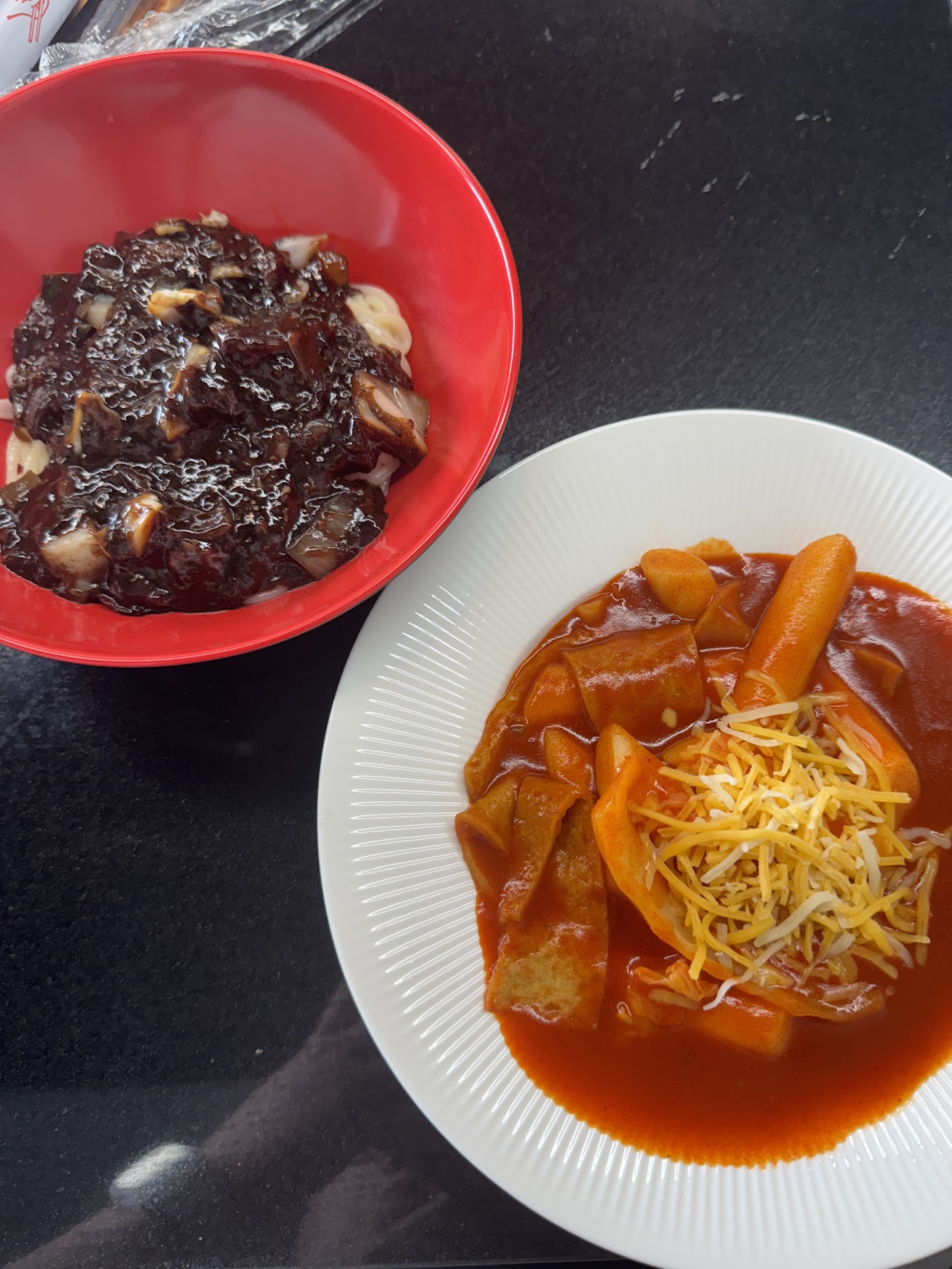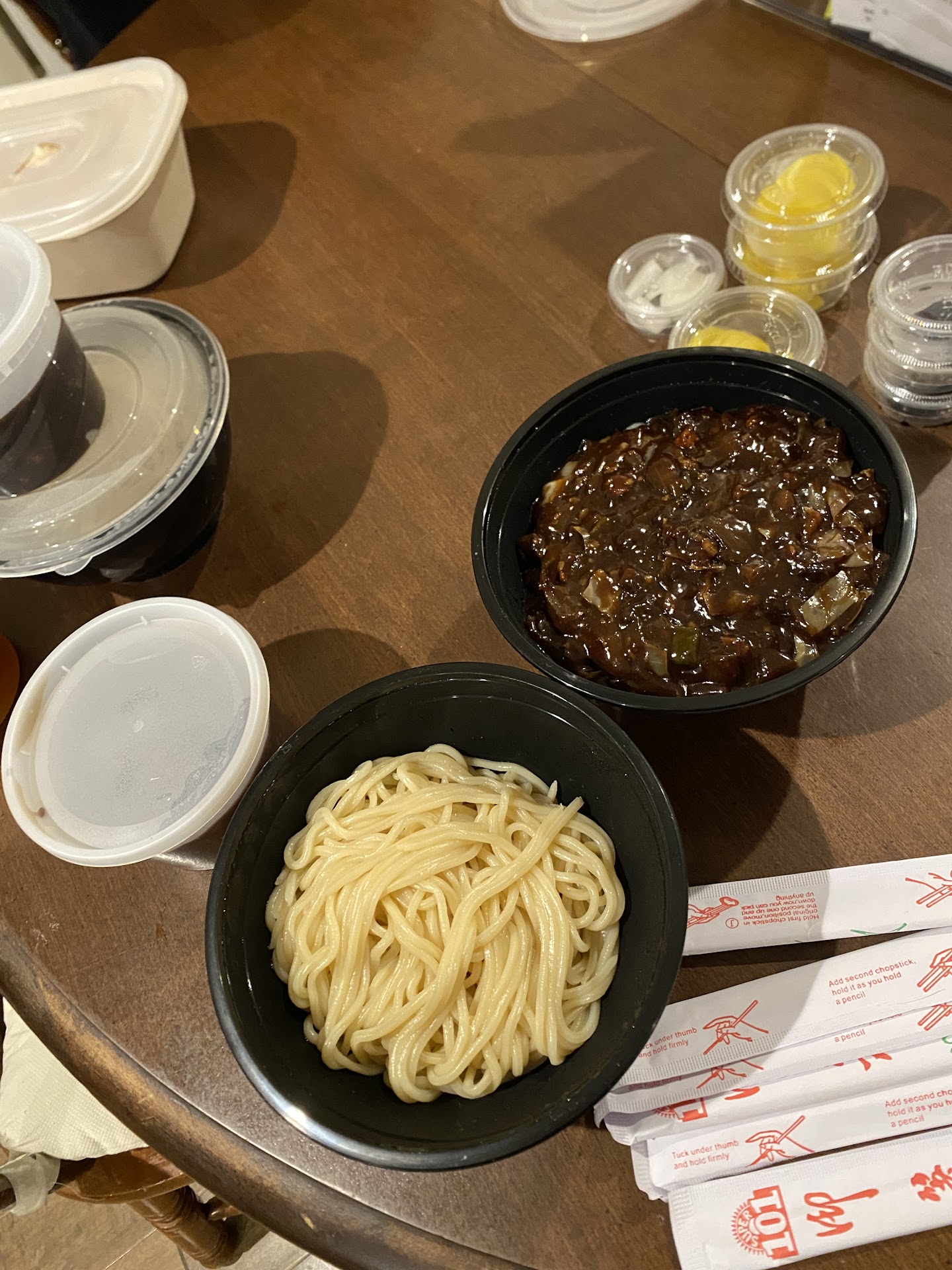 I will say, if you are ordering online, double check the prices when placing an order because I don’t think it’s correct. Online, it says a bowl of jajangmyeon is 5.99 but it’s actually around 11.99 (maybe they were referring to a kids size but I’m not sure). My roommate went to pick up the food and this is what we ordered: Corn Dog Jajangmyeon Tangsuyuk
