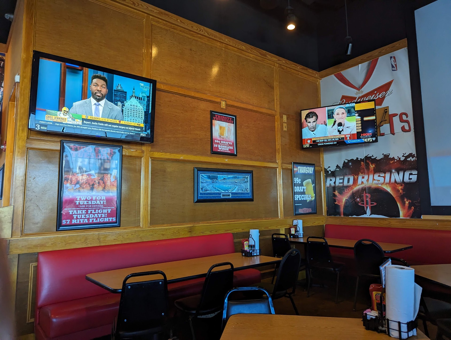 According to Google, I had not been here in FIVE years...because our last experience there was horrible, HOWEVER, out of desperation for wings (first world problem, I know) we decided to give it another whirl. Monday night service at around 7:00 pm. Place was EMPTY, even though the Astros' game was being shown on a floor to ceiling screen. We were a bit concerned given the lack of patronage, and remembered that an issue with our last visit was HORRIBLE table service -- took well over an hour to receive our food that last trip, so we were prepared to be disappointed once more, but proceeded anyway. The wings on the last trip were also disappointing -- I became a wing fan in Aggieland at the original Wings n More - falling in love with hot garlic. Ordered those on that previous trip and unfortunately, Brewing's idea of hot "garlic" is to sprinkle garlic powder in the hot sauce - very gritty due to garlic granules and not tasty at all. SO, I knew I would not order that flavor again.