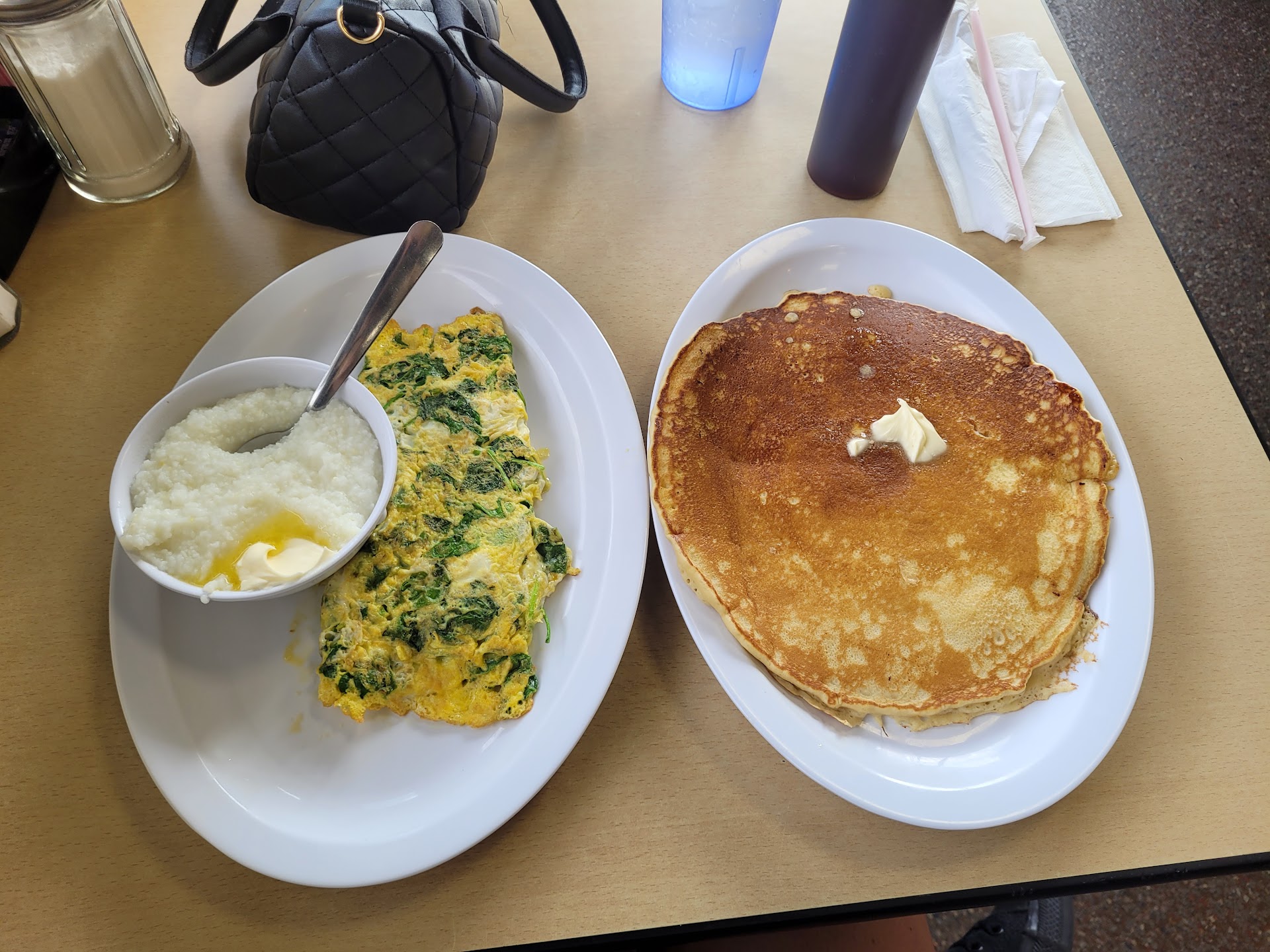 I ordered a spinach omelette that came with grits and these were both disappointing as well. I asked the waiter if cheese came on the spinach omelette prior to ordering it and he said that it did. However, after biting into the omelette it was clear that there was no cheese on the omelette and it was also unseasoned. I added quite a bit of salt and pepper to my grits and they were still bland.