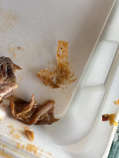 As far as the ribs they were also hard and chewy. The ribs were definitely not cooked the same day I ordered them. I could not finish the entire meal. To make matters worse I found plastic bits in the ribs as shown in the picture.