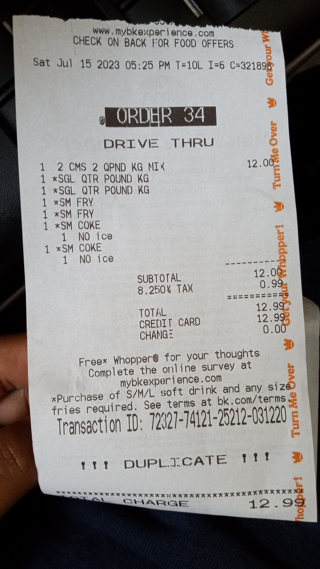 Ā Ā Ā Read moreHad lunch today around 1 - 2. inside dinning, had to wait 1 person taking orders counter and drive through. While eating a actual bum (Black man) came in, hungry very little money and wanted to use the bathroom, they were rude to him, they locked the bathroom wanted him to leave. He asked to borrow a buck from me, but I had no change. He sat down they hollered for him to go. I was disturbed while eating. so i got up told him to come here and order a meal. I paid for it about 12 bucks on card. I then told the lady (Hispanic), now let him set down and eat and use the restroom. I told him to enjoy and take his time. I went back to eating, as I was finishing another gentleman (Blackman) came in. Wearing working clothes, boots, jeans, t-shirt. Went to use restroom, it was locked, it appeared he wanted to clean up, He asked somewhat loudly for them to unlock restrooms. Same (Hispanic) lady hollered "NO!, you must order something first". The man appeared to be dirty from working. A argument pursued and cussing proceeded from the man and the lady for about 3 to 5 min approximately. He left in a new Mercedas, it is quite obvious that the personnel working this BK are rude and very discriminatory towards Darker...