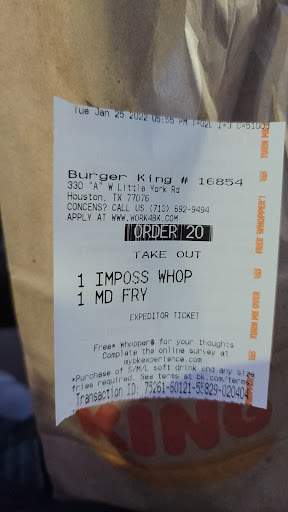 Ā Ā Ā Read moreWent here with my son. Got a Texas Double Whopper and a chicken sandwich. The Texas Double Whopper only had 3 jalapeno slices on it. I showed the manager and asked if I could have some jalapenos like the picture of the burger they advertise. She said the burgers only supposed to come with four jalapeno slices. I told her come on I'm from Houston Texas. We eat raw jalapenos for breakfast. She gave me four more slices of jalapenos ha ha ha. If you're going to put Texas in the name. You got to load it down...