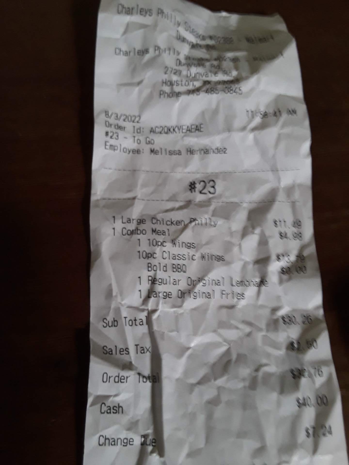 Read moreThis Charley’s at Dunvale is better cheesesteak than the one they have to Galleria. The cheesesteak they have on Galleria is not even delicious…not even close to the one I always getting on Dunvale. Dunvale probably has better cooks than the one they have on galleria, I didn’t even enjoy the 2 cheesesteak and my wife cheesesteak that I ordered and even my wife said the one on Dunvale is way more better as satisfaction guaranteed!!! The one at galleria need some improvement or Dunvale need to send one of their cooks there to teach them. I would recommend Dunvale Charley’s to my friends and relatives than one at galleria. As an honest review…people will only say something good about their honest experience or say...