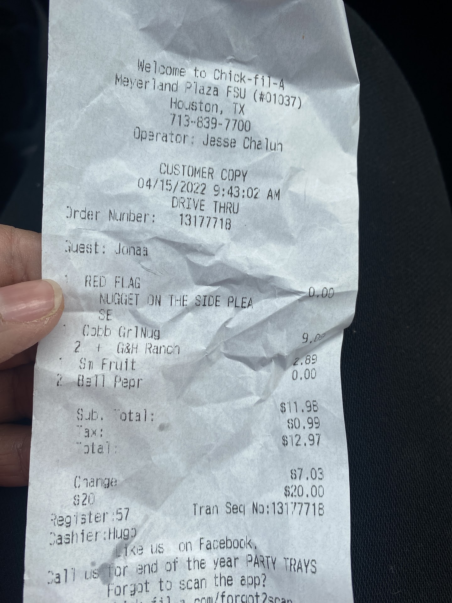 Read moreHorrible experience..this was my first and last time going to this location. The team there was rude, and the manager jessie Rodriguez showed poor customer service. I ordered a platter of strips, I order this every time I go to chick-fil-a. I'm familiar with the estimated wait time, there were only 3 people in the drive through line this Monday evening so I was excited. First time ever have I witnessed, I was sure that the wait time wasn't going to be as long. I was told to pull up and they would get my order ready. 30 minutes later a team member comes over to my truck after 3 other cars who also pulled up to wait were served, and asked me did I need something? Really? Yeah my order! They had no clue what my order was and didn't try to start preparing it either. I walked over to the window to check on the order and was told someone is bringing it out right now, even though no one ever showed up, were going on 40 minutes now and no one has said a word to me about my order, no sorry for the wait, no acknowledgement, the whole time jessie Rodriguez was continuing to fill orders coming through the drive thru. He didn't have enough since to stop and figure out what the issue was with my order. He was aware there was a problem because the young man who asked me if I needed anything told him about my order and nothing happened, also as I stood at the window and asked about my order he was present. It wasn't until after 45 minutes later when I walked back to the window and asked to speak with jessie, is when I got my order. I spent 70$ at chick-fil-a and my business was not appreciated. They really bring the...