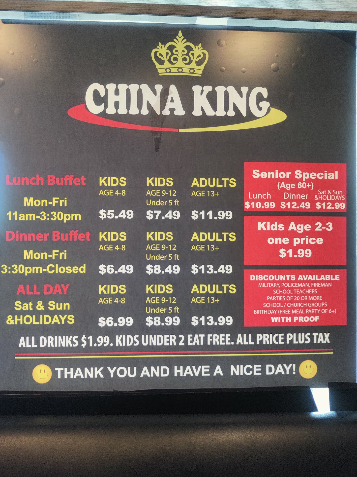Read moreThis is one of the worst Chinese buffets I have ever been to. The food they serve is cold at times. The biggest problem is the quality of the food that is served at this location. You can definitely tell by looking at the food served here that it's reheated at times. Don't ever eat the salad it's always wilted, and the croutons are mixed in making this a gross mushy mess. I tried to eat some of the crab, but it was smelling and super mushy, and they were tiny in size compared to other buffets. Business must be really slow. The reason I have come to this conclusion is that when they do add fresh food, it's always in very small quantities. I walked over to the dessert and fresh fruit section, and it was a disaster. I honestly feel like they never wipe anything down or stir the food to make it look appealing and presentable. This place is just a dirty mess. The windows are full of fingerprints. The tables look like they were wiped with a dirty rag, I don't even want to imagine what the kitchen looks like. Obviously, I would never return. I have given this location plenty of chances. If you like shrimp, it's probably the best item on the steam table. The shrimp are large and taste good. They are fried with a spice sprinkled on them, no batter, just deep-fried. The bathrooms are hit and miss when it comes to cleanliness, but on a positive note, they do have hot water, liquid hand soap, and...