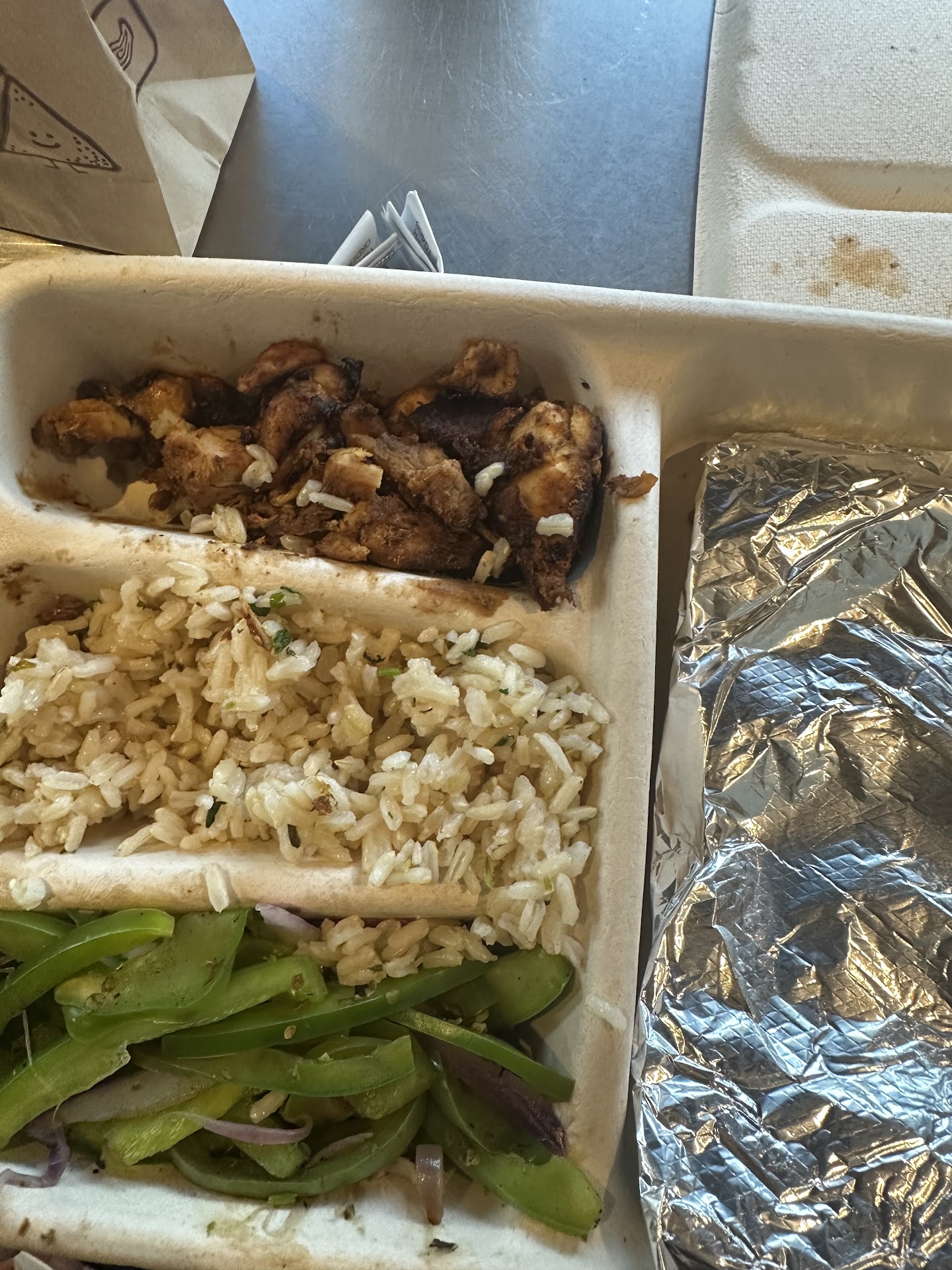 My own ordeal continued when I discovered halfway home that our drinks had been omitted. I returned to the store where the same indifferent cashier handed me a cup without a word. After filling our drinks and finally reaching home, neither entree was marked with our names, and my husband's dish mistakenly contained chicken al pastor instead of the regular chicken we ordered. The chicken al pastor was too spicy for him to eat due to a medical condition.