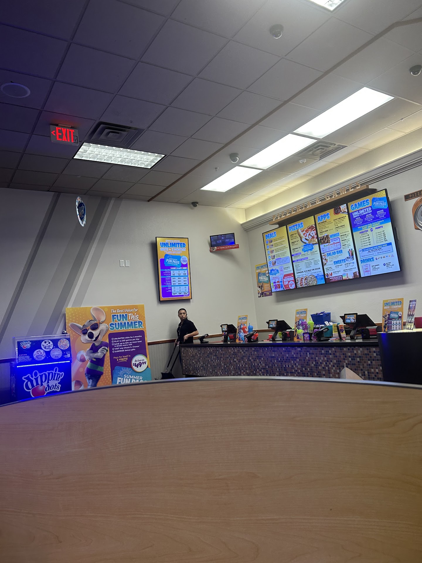There were a few games that didn't work. I bought one of those cups n when I turned around this little girl was drinking out of my cup. I guess she knew it was mine because she threw it down grabbed the mouse off the straw n ran. Come to find out her mom was sitting in the booth right next to us just paying her kid no mind. Kids were jumping off tables. Another little girl kept taking all of my boys balls n standing in his lane on top of the game walking back and forth. When I asked her to stop her mom finally started paying attention came told her to get off the game she was standing on n turned around and left her right there so she layed across 2 of the games lanes. Kids kept running into my daughter. She now has a bruise on her face. Parents watching them do it kids won't apologize parents won't apologize. Them when I was leaving the kids were trying to get some toys n this little kid with candy running down her face kept standing right in my kids face. My daughter told her to stop. She kept blowing. Her mom was standing right next to her laughing so I told her to stop. Then the mom caught an attitude like I was telling her something wrong. Staff was wonderful and the food was great. I'd just rather visit the fairmont or Wesleyan location where parents teach their children how to act. The staff also replaced the straw and toy on the cup for my daughter. The food was good salad bar was fresh. There weren't many games out of service and they didn't have the little gym like McDonald's like I see at most chuck e cheeses but I see why. If they had one free item in there it would just be...
