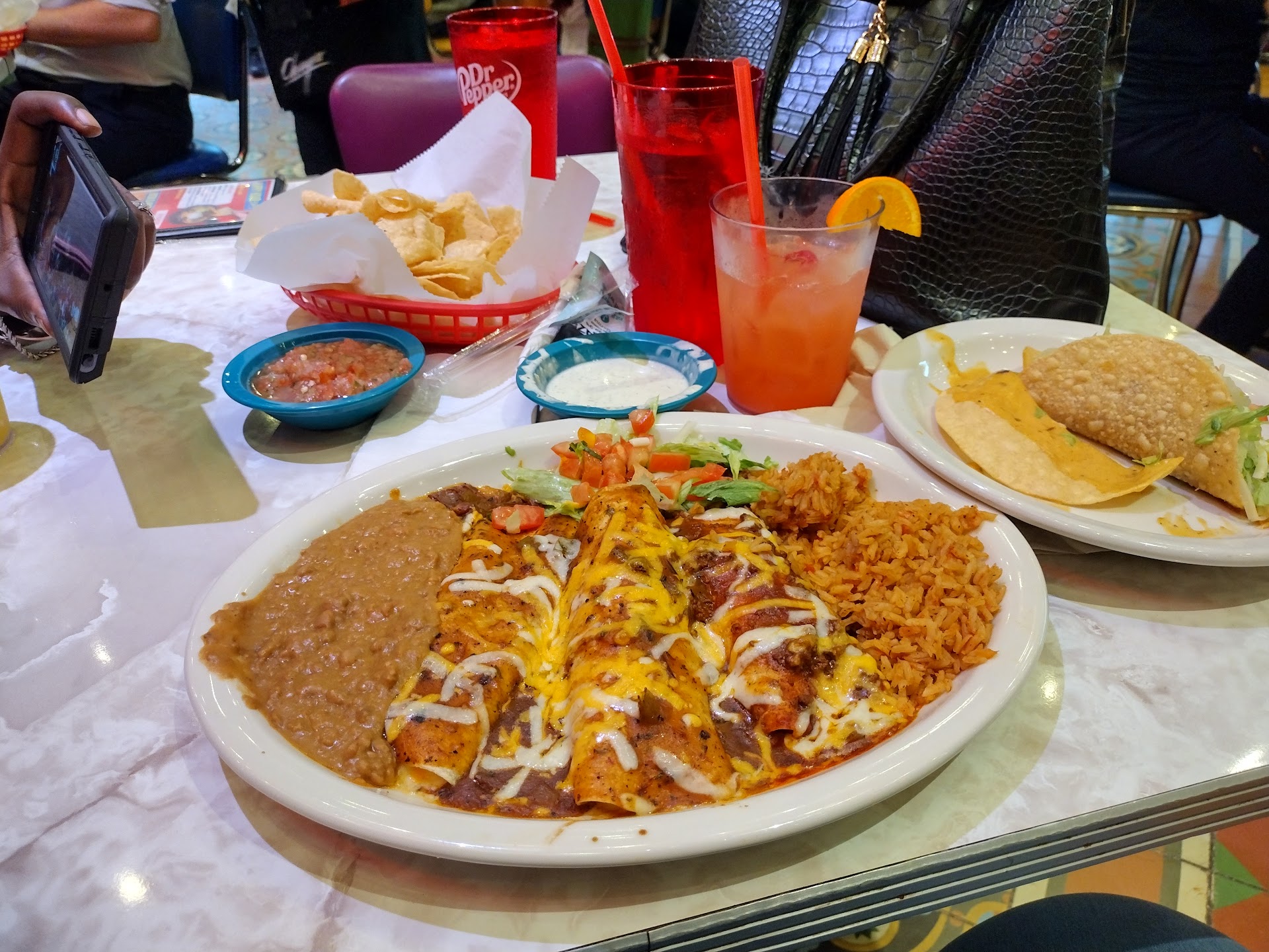 I watched service drinks, food and to-go containers to some women who came after us. Drinks to another table and chips and drinks to another table. Finally I got my plate. Extremely hot, probably under the salamander for a few minutes. Anyway, the food was great but unfortunately, I couldn't finish it because I consumed too many chips waiting on drinks and food
