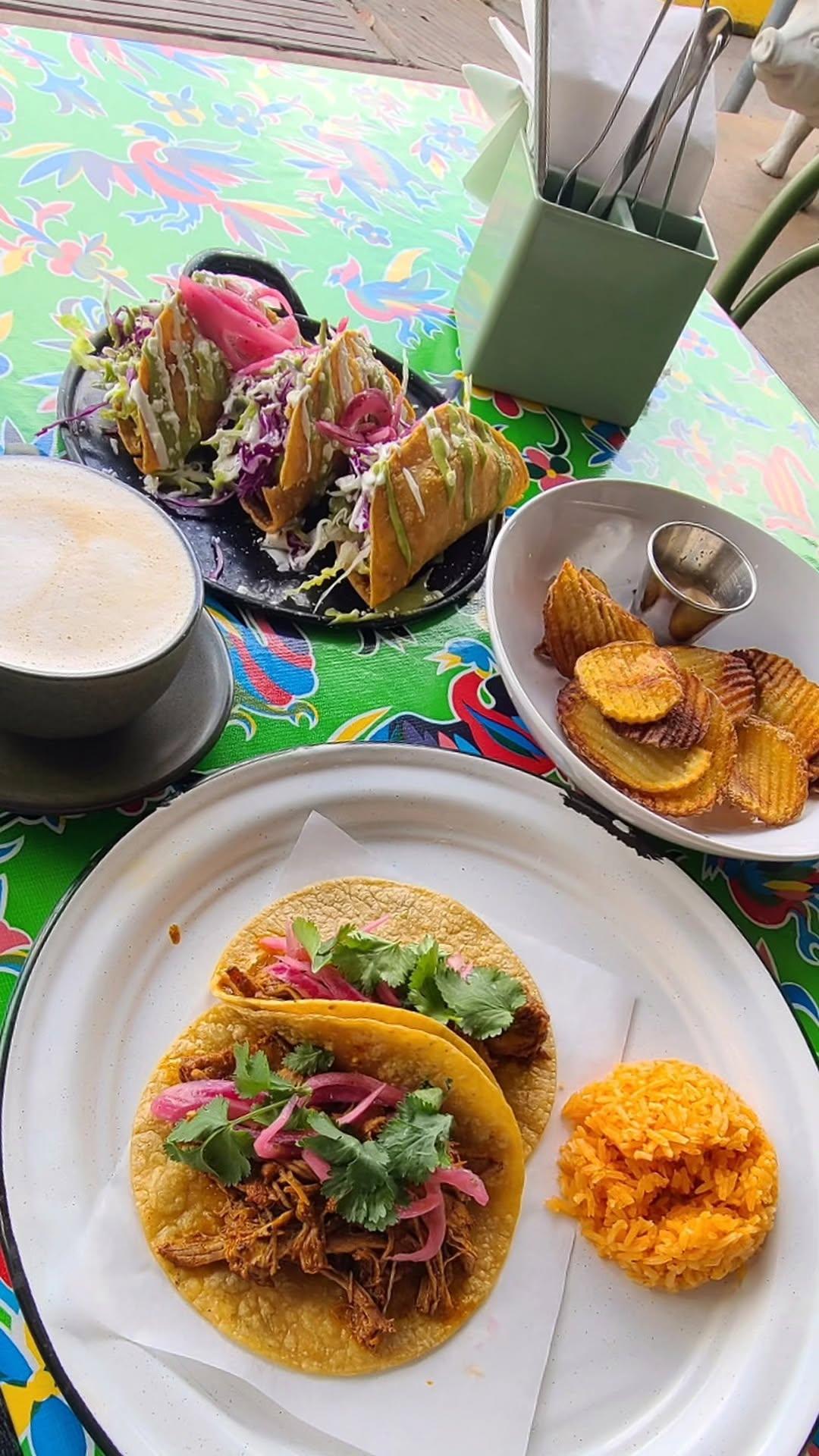 For our entree I tried the Cochinita Pibil. It’s pulled pork w/ citrus achiote, & habanero-red onion escabeche. It came with rice and more refried black beans (yay!). The pork was uber flavorful and tender. Paired with the beans and rice in a tortilla, sent me straight to flavor town, with Chef Victoria as mayor! We also tried 2 tacos. Cochinita Pibil and Vegan Tinga. The Pibil is the same pork I got in my entree and the Tinga is Lions Mane and Oyster Mushrooms, chipotle en adobo, caramelized onion, vegan avocado cream and cilantro. Neither of us cared for the Tinga, but we didn’t care with the rest of the amazing fare on our table! On our way out we got two iced coffees for the next morning. A horchata latte and iced coffee. We also grabbed a bag of their homemade tortilla chips. Holy smokes, you gotta try these! They have a crazy crunch but the chili seasoning on them takes them up 10 levels!