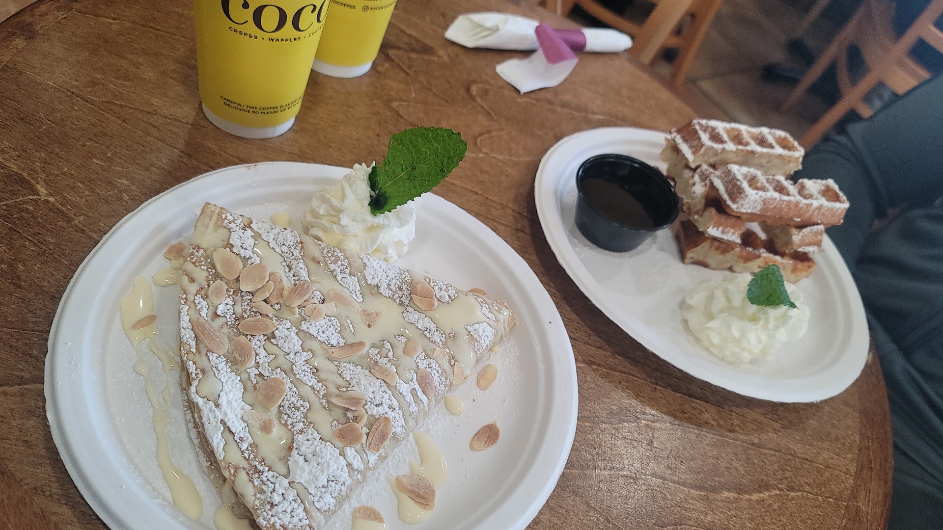 Read moreFirst of all, all of it is a yes. Yes to yes to everything. Service was great, orders came out quickly eventhough it was slightly busy. Every staff member was helpful and smiling (might be because it was still morning) but could just be how they are. Also, we are from New Jersey, visiting. Back to the establishment, I love the fact that the crepes are not too sweet as though they want to give you diabetes but it is still delicious for a sweet tooth person like me. My hubby had the sugar waffles and I had toasted Almonds with vanilla custard. Okay y'all, this where we both got greedy...from the looks of the food, you'd think "hmmm this will not be filling" so knowing how delicious it was, we ordered round 2 before finishing round 1 - I had crepes with Strawberries for round 2, hubby had same thing as round 1. People, after I finished round 1 and drank my organic Chai tea latte, I was full and they called out our round 2...it was ready. đ Hubby tried to dig into his round 2 but couldn't finish...we took it to go.