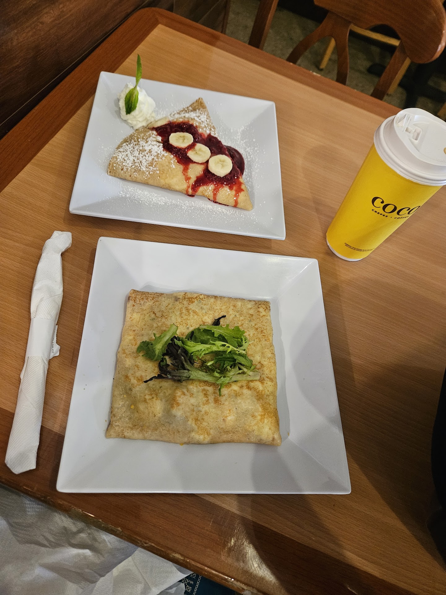 Read moreCoco Crepes is perfection! I have been here twice in 6 months and each time the experience has been nothing but amazing! The servers are helpful and very nice. The food arrived both times fairly quickly and was warm and presented very elegantly. Pictured in this review is my order of the savory Chicken an spinach crepe and the sweet make your own with banana and peanut butter with Chocolate sauce.