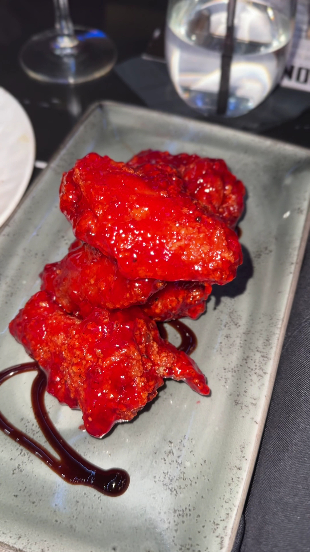 Once seated, the restaurant is aesthetically pleasing, and our waitress (whose name I forgot) was friendly. We ordered hookah and asked about the strawberry wingsâshe raved about them, so we decided to try them. Next came drinks. I ordered a tequila lychee martini. It was tasty but not outstanding.