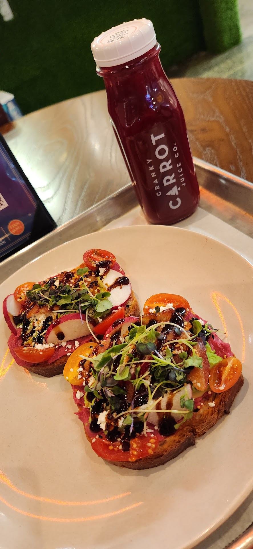 Read moreI ordered the Beet Hummus Toast and the Revive Juice, and everything was absolutely delicious—tasty, fresh, and served in a good portion. However, I gave a low score for the service because of an issue with the avocado toast. I initially asked for the Avocado Loaded Toast without caramelized onions, but I was told the onions were already mixed with the cheese. Fine, I decided to go for the regular Avocado Toast instead and requested no onions again (since this one comes with raw onions on top). To my surprise, they responded that they prepare the dish as it is, and I would need to remove the onions myself. At most restaurants or food halls, when I request no onions (unless they are already mixed in), the staff accommodates without hesitation. Unfortunately, this was not the case here. I ended up switching to the Beet Hummus Toast because they refused to remove the onions from the other options, even though it was...