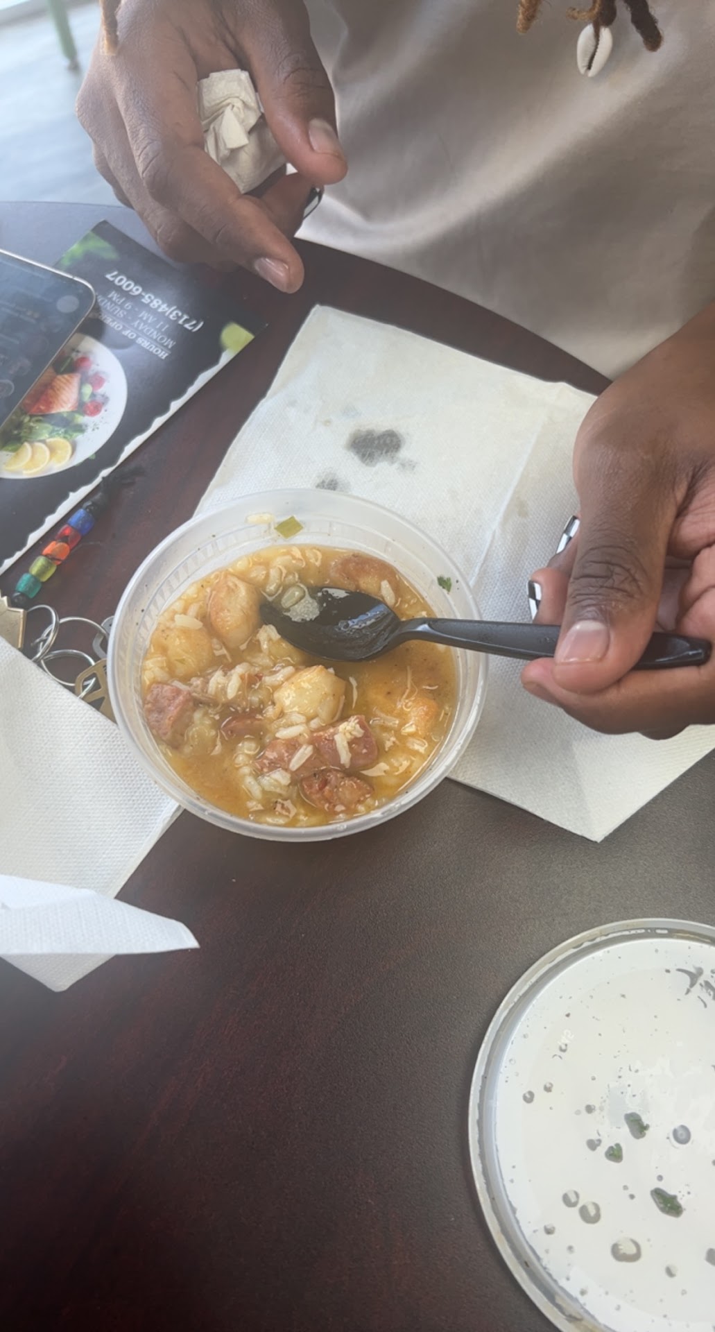 I made a it a point to not place my order until I can get them on the phone and specifically ask for my ranch to be included in the bag.The manager Court told me specifically They would make sure I had ranch, albeit with a sarcastic tone. Iām sure you can guess what happened next. I called back and he act like he had no idea what I was talking about, said they didnāt have any DoorDash orders, and I spent most of the time with the phone on the counter listening to the music in the background because he claimed he couldnāt hear me even though I could hear myself echo just fine. For the prices, there should be no problems. If youāre going to charge $20 for 3.5 wings and some fries, you should make sure they come with what they need to come with and have a working phone to top it off. Not to mention my gumbo jeaux was watered down and the rice was hard so the meal wasnt even good. I spent my fourth and last $5 off for spending $50 (thatās how much Iāve eaten here) on this order and will just leave well enough alone. Never again itās just too expensive for what it is and thereās too many options for gumbo in the area.