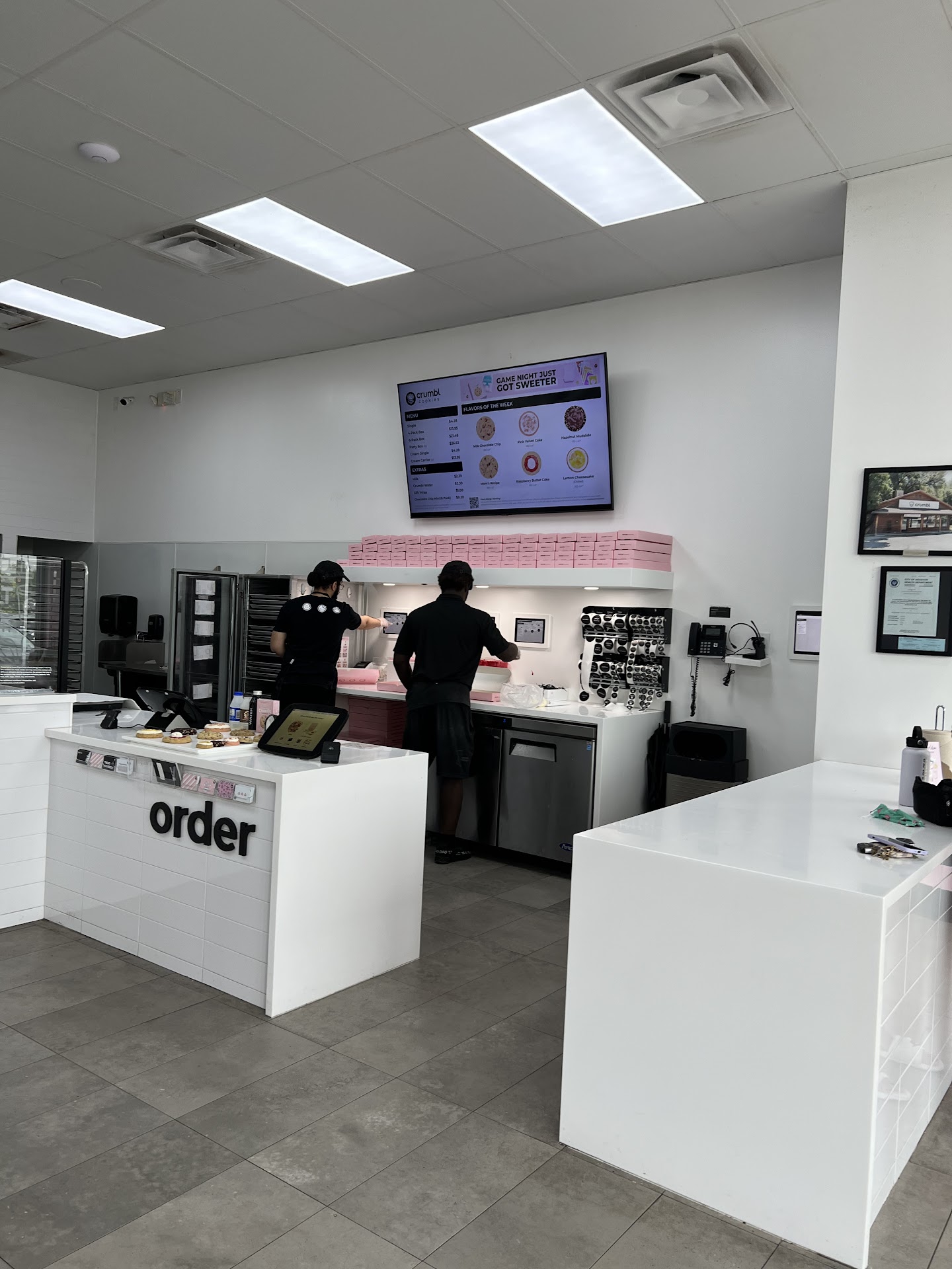 This was my first time coming to Crumbl so I was excited. I decided to order on the App, & do a pick up (thank goodness I ordered ahead of time). I ordered 1 thing which was the Strawberry Tres Leches cake, & walked in at 11am. There were about 4 to 5 workers, & not a single one said “welcome” or “I’ll be right with you” or a simple nod or smile to acknowledge me at all. I was the only customer in that store for a good 5 minutes before another customer walked in so it wasn’t like they were busy helping someone else. I walked towards the register, & waited an awkward 3-5 minutes before one girl nudged the shorter girl, & FINALLY she came over, & asked me what I needed. I said pick up for “Kathleen” which she grabbed my box (it was already ready this whole time just sitting on the counter), & handed it to me before she was about to walk away again, I caught her in time asking for a fork because I noticed there weren’t any out. Which is odd because they just opened an hour ago, & there’s no forks or napkins? Just an empty roll on display. SMH. She didn’t communicate once again, just walked away, & there I am left in awkward silence once again. Waited another full minute for her to emerge, hand one to me, & that was that. I said “Thank you. Have a great day.” & with no surprise she didn’t say anything back.