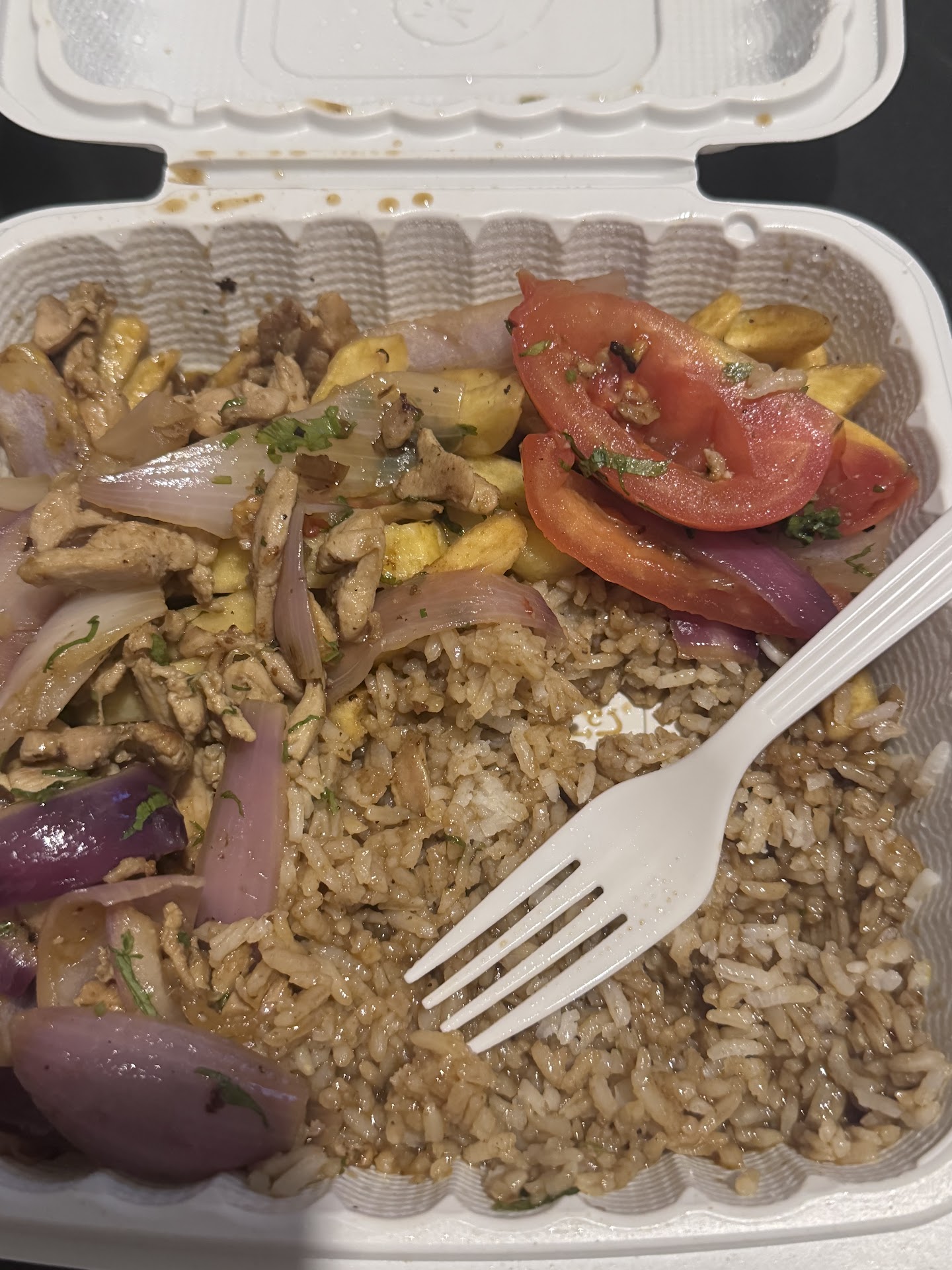 First of all, no one answers the phone, and their curbside pickup is nonexistent—you have to go inside. They really need to rethink their takeout food packaging. The food was extremely salty, but the worst part was the rice and fries, which were completely drenched in the gravy from the chicken.