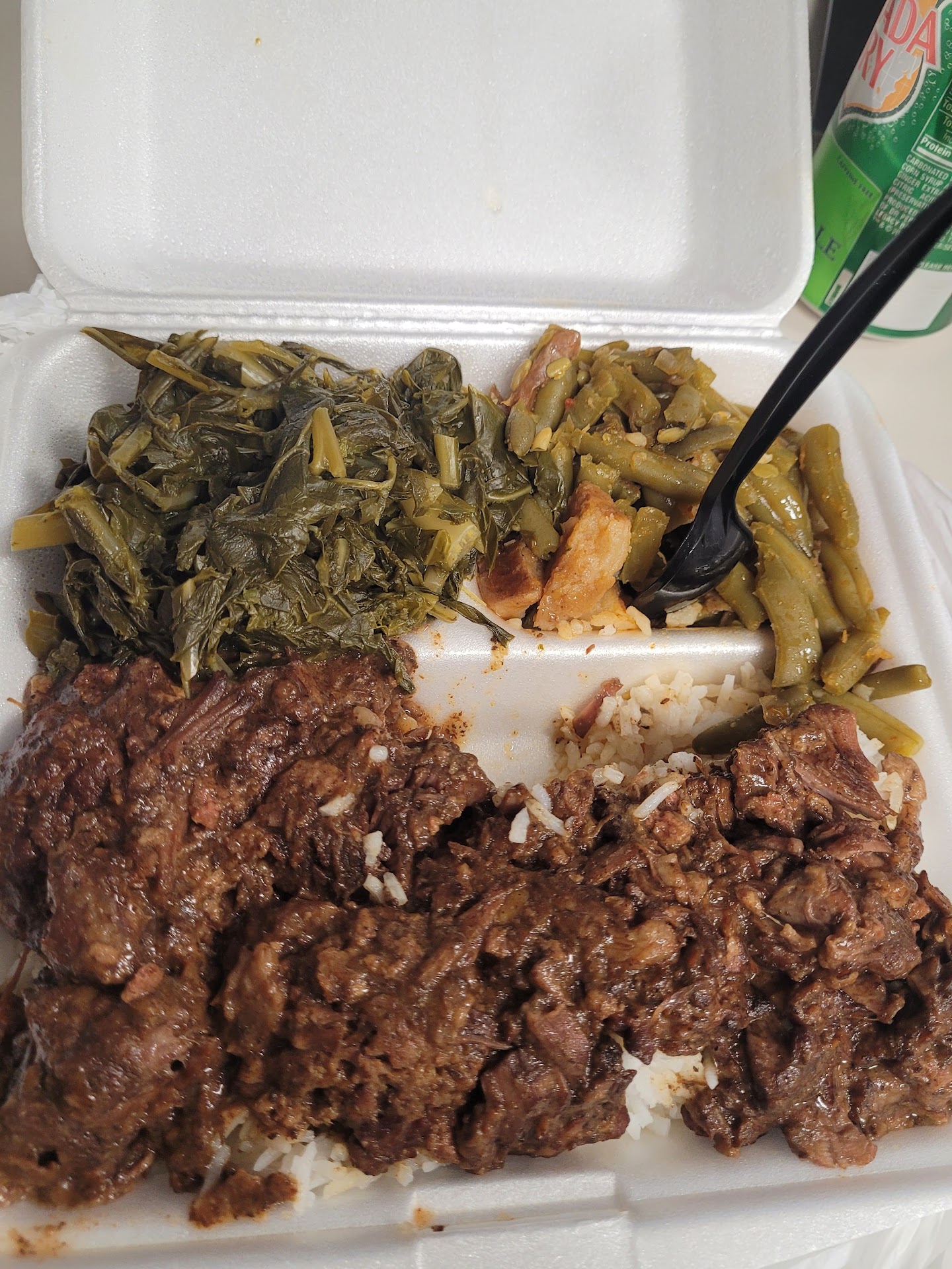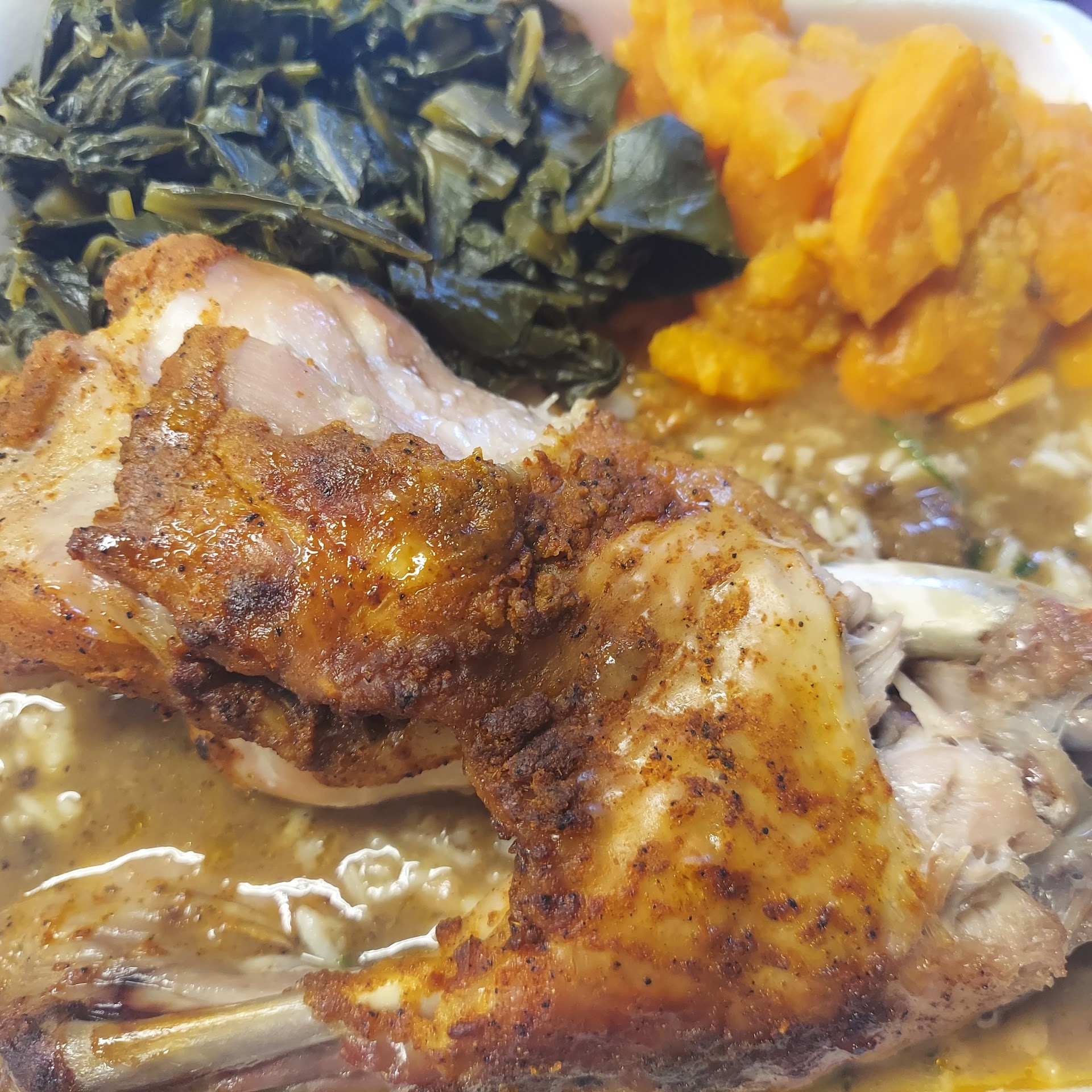 Read more100/10. This place is amazing, we stopped in at about 1:30 and unbelievably almost empty!!? This is the best Cajun food I've had in along time, coming from a Cajun that's saying something. We got the beef tips mac n cheese and black eyed peas , each plate comes with rice and gravy and corn bread. The second plate was the turkey leg, sweet potatoes and collard greens,, also with rice and gravy and corn bread. Now, the beef tips were tender and well seasoned and the gravy was absolutely perfect, the rice was perfect texture. The black eyed peas were well seasoned and perfect textured, the Mac n cheese was tender and had a little spice. The turkey leg was fall off the bone and perfectly seasoned, the sweet potatoes were amazing and not too sweet, the collard greens were AMAZING with a little heat, just the way I like. Everything was served with thiccck portions and hot. I cannot recommend this...