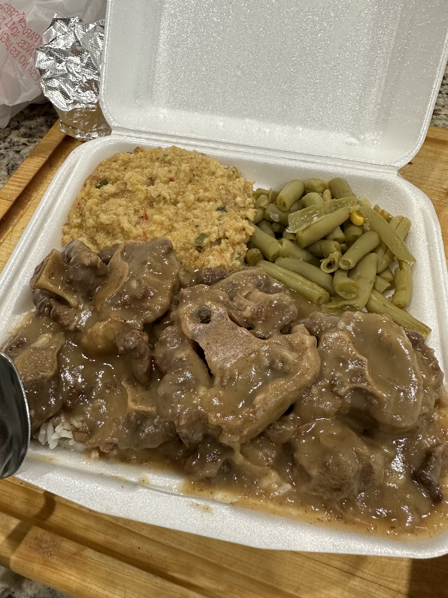 Read more100/10. This place is amazing, we stopped in at about 1:30 and unbelievably almost empty!!? This is the best Cajun food I've had in along time, coming from a Cajun that's saying something. We got the beef tips mac n cheese and black eyed peas , each plate comes with rice and gravy and corn bread. The second plate was the turkey leg, sweet potatoes and collard greens,, also with rice and gravy and corn bread. Now, the beef tips were tender and well seasoned and the gravy was absolutely perfect, the rice was perfect texture. The black eyed peas were well seasoned and perfect textured, the Mac n cheese was tender and had a little spice. The turkey leg was fall off the bone and perfectly seasoned, the sweet potatoes were amazing and not too sweet, the collard greens were AMAZING with a little heat, just the way I like. Everything was served with thiccck portions and hot. I cannot recommend this...