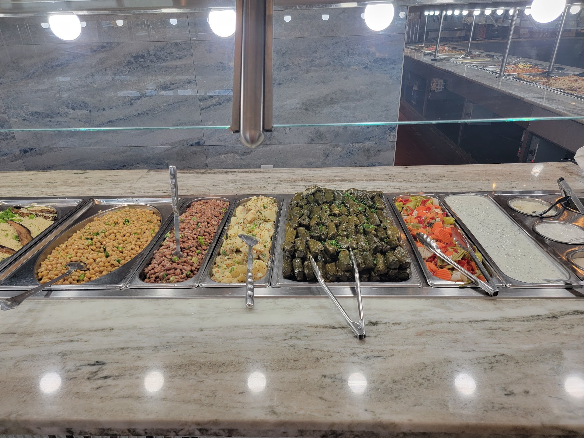 So we went on the weekend, so the price per person was automatically 23.99. I think it's cheaper during the week during lunch? Basically you serve yourself, and pay when you leave. You pick up your own drink and get a new plate every time you want to get something new. The first thing you see when you go in is a vast array of salads, vegan options, pickled items, leafy greeny goodness, hummus of different varieties and flavors; spicy avocado etc. then tahini and other sauces at the end. There is a folded basket covered with napkins 🧺 that houses the pita bread. Almost missed it, next to that are 2 trays of small pizzas cheese and olives? Next down the line is various meats and and baked fish. The lamb was well cooked (kinda like brisket). Gyro meat with onions. I was able to assemble 2 mini gyro 🥙 tacos with the meat the fluffy pita 🫓 and a salad plate. The dessert section has baklava with honey syrup on the side but was plenty sweet without it. Vanilla ice 🍦 cream machine. The drink section has an odd selection lineup like Mr pibb Xtra (rare) and other uncommon beverages that were great. Like rose water and watermelon juice with another flavor I didn't get to try; I had tea. The only condiments at the table were salt and pepper, you had to fix your unsweeted tea there next to the dessert aisle as that's where all the sugar packets were placed. The bathrooms were very nice and clean. The cleaner would occasionally take away plates throughout your buffet adventure. All in all it was a good experience and they do offer senior discounts to those that qualify for them. Oh, and I loved the baba gounoush, it was tangy, but the eggplant was prevalent in it. The falafel was super crispy. I know I'm forgetting a ton of dishes, but it's impossible to taste everything on your first visit. They only had 2 soup options, vermicelli noodles with chicken broth and carrots and lentil and some type of shredded leaf soup; I preferred the lentil soup as it reminded me of starchy potato base. Will return...