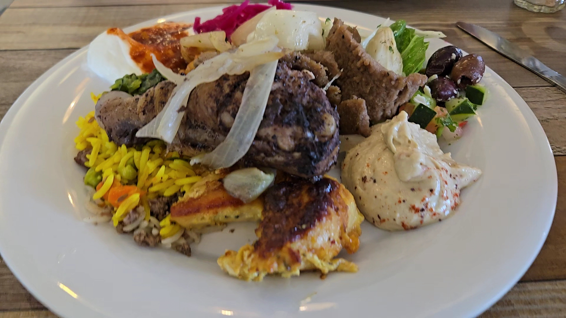 So we went on the weekend, so the price per person was automatically 23.99. I think it's cheaper during the week during lunch? Basically you serve yourself, and pay when you leave. You pick up your own drink and get a new plate every time you want to get something new. The first thing you see when you go in is a vast array of salads, vegan options, pickled items, leafy greeny goodness, hummus of different varieties and flavors; spicy avocado etc. then tahini and other sauces at the end. There is a folded basket covered with napkins 🧺 that houses the pita bread. Almost missed it, next to that are 2 trays of small pizzas cheese and olives? Next down the line is various meats and and baked fish. The lamb was well cooked (kinda like brisket). Gyro meat with onions. I was able to assemble 2 mini gyro 🥙 tacos with the meat the fluffy pita 🫓 and a salad plate. The dessert section has baklava with honey syrup on the side but was plenty sweet without it. Vanilla ice 🍦 cream machine. The drink section has an odd selection lineup like Mr pibb Xtra (rare) and other uncommon beverages that were great. Like rose water and watermelon juice with another flavor I didn't get to try; I had tea. The only condiments at the table were salt and pepper, you had to fix your unsweeted tea there next to the dessert aisle as that's where all the sugar packets were placed. The bathrooms were very nice and clean. The cleaner would occasionally take away plates throughout your buffet adventure. All in all it was a good experience and they do offer senior discounts to those that qualify for them. Oh, and I loved the baba gounoush, it was tangy, but the eggplant was prevalent in it. The falafel was super crispy. I know I'm forgetting a ton of dishes, but it's impossible to taste everything on your first visit. They only had 2 soup options, vermicelli noodles with chicken broth and carrots and lentil and some type of shredded leaf soup; I preferred the lentil soup as it reminded me of starchy potato base. Will return...