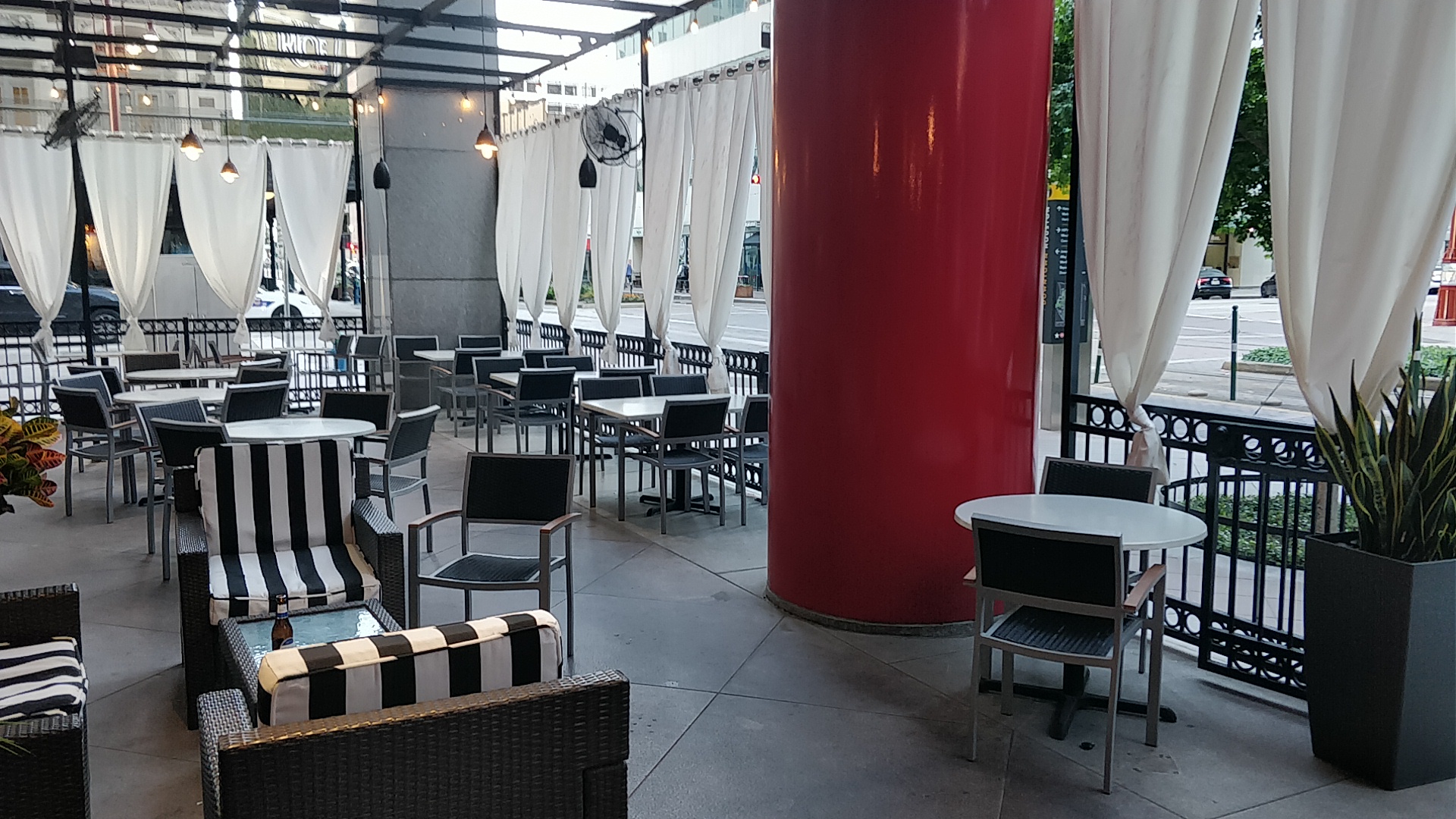 As for the atmosphere, the place was dead on a Saturday night. We chose to sit outside.They had misting fans running but it was a cool night, and they just made things damp. Our table was fine for awhile, but eventually it began to get wet. our waitress turned them off at our request but seemed annoyed by it.