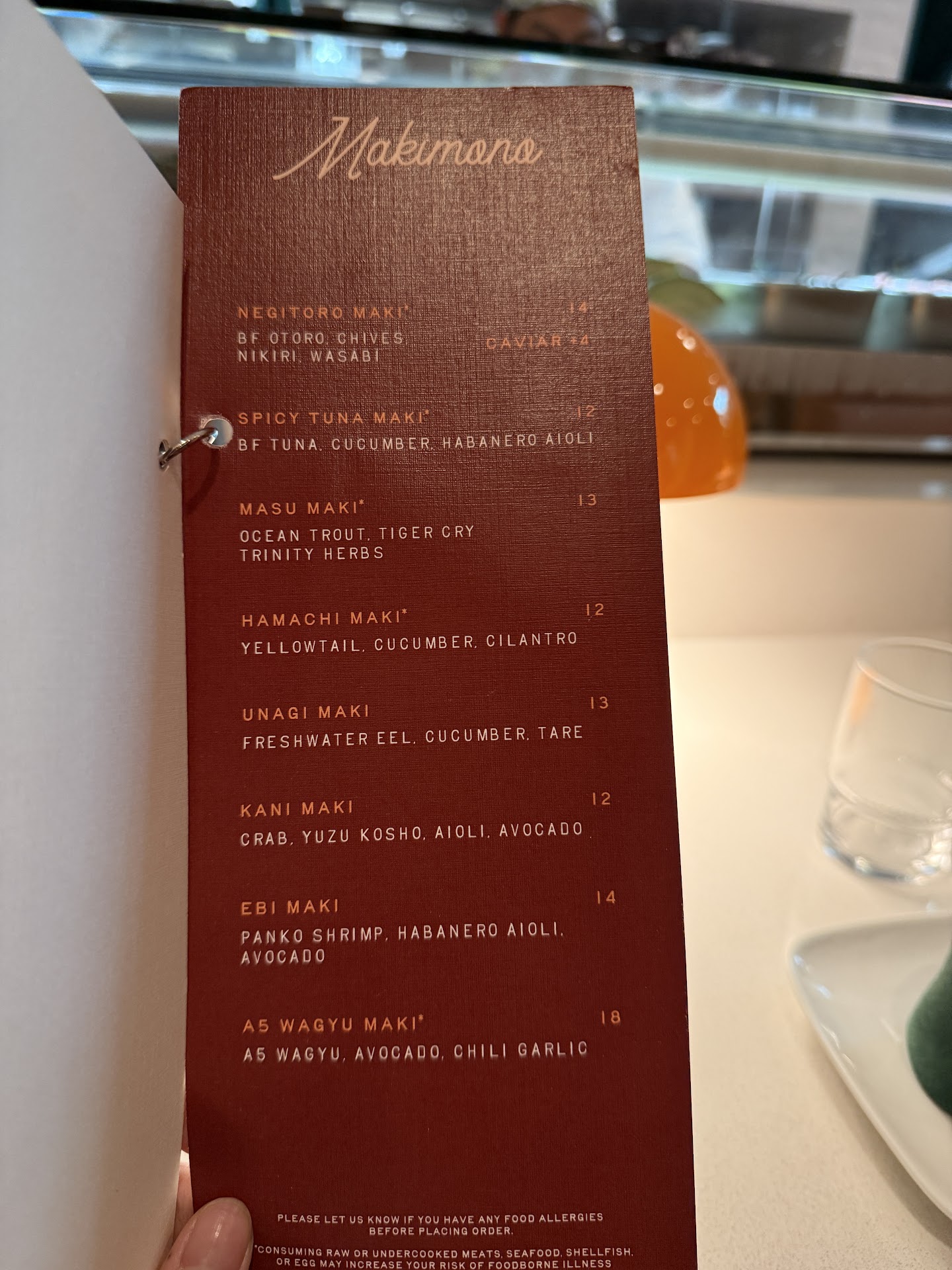 The A5 wagyu maki came with five pieces, but like the other maki, they were large and topped with an ample amount of wagyu pieces. The wagyu was torched, and you can taste the smokiness. However, the maki consisted of avocado, which I think drowned out the A5 wagyu, and it would have been better without the avocado.