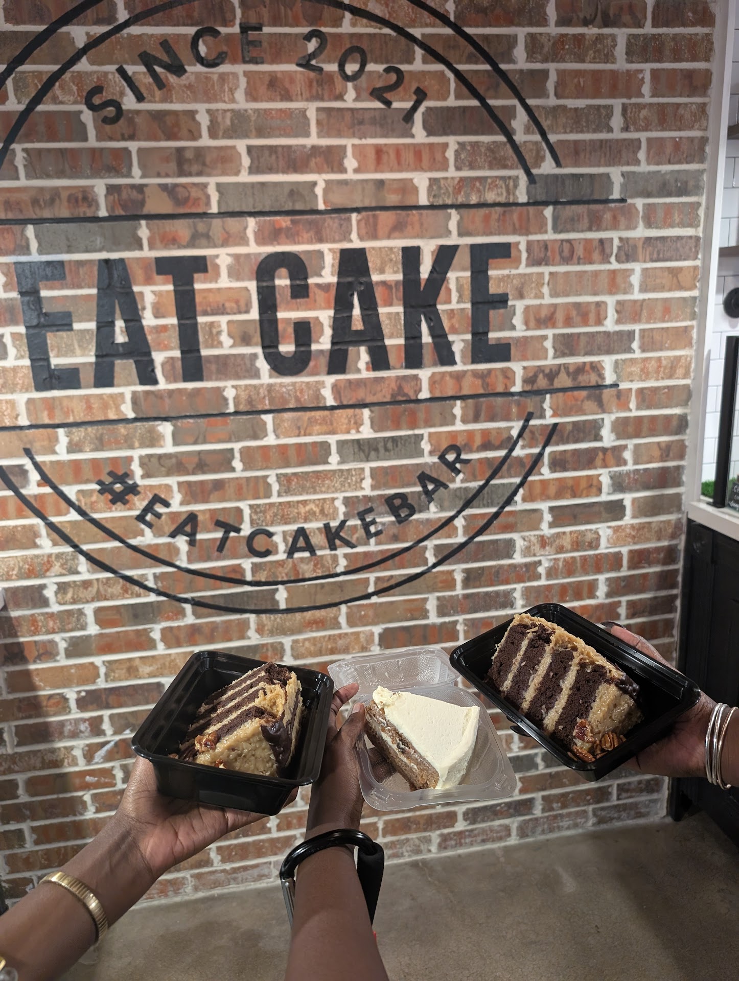 Read moreService- I always start with service because if service isn't polite/cordial - I don't need to be there. They are soooooooo SWEET... almost like they're made of cakes. The woman at the cash desk explained the cakes gave us recommendations told us about popular picks! I love that (b/c sometimes I'm indecisive) Food- plenty of options! Especially when it comes to cakes and cookies!!!! Also their cheese cakes look decadent!! Going back to try the biscoff cheesecake! I had the carrot cake, my sister and cousin had this THICCCK a** piece of fudgy German chocolate cake. My cousin had a late! Atmosphere- cute but I gave it 4 stars because u wish I could eat in the premise and enjoy the bakery atmosphere.