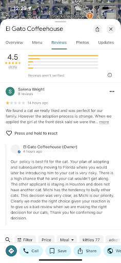 I've had a wretched experience with the coordinator, Kirsten. She kept messing up the facts and then scrutinizing me and re-traumatizing me regarding my deceased cat whom I loved and care from when he was 3 weeks to 15 years old. I took him to Gulf Coast about a year ago when he fell ill with a low platelet count and hospitalized him for 9 days, but he was never well enough to get tested despite the Doctor having hope. He had a stroke in his brain, and I got there within 15 minutes and said goodbye to him. There is nothing shady about this. The Doctor presumed he either had an aggressive cancer or an autoimmune disease. No autopsy. Unfortunately, Kirsten wrote in her notes: Ollie died of cancer. Then she had the reviewer call the hospital and attempt to confirm he died of cancer, which was false data. Then, she scrutinizes me, and places me under suspicion, and I am asked to provide the details AGAIN (aka relive the trauma) of Ollieâs passing. This is all because she wasnât listening. She also kept assuming Ollie was a dog, including the first time the reviewer called Gulf Coast for his vaccination records. This also made no sense â why would they call the emergency hospital for his vaccination records and not his vet? And then come at me? I had to reiterate that Ollie was not a DOG three times. Kirsten twisted facts and could not retain any information I relayed to her. Moreover, there was no accountability on her end or El Gatoâs end. Ollieâs brother Mimo is still alive and well at 16.5 yrs. old so why was Kirsten so hyper-focused on my deceased cat? Shouldn't she be concerned with the cat that's alive? She treated me like I abused Ollie. Fun fact El Gato: The average lifespan of a cat is 13-15 yrs so for a cat to pass away after 15 years in my care is NOT SUSPICOUS. I asked Kirsten multiple times to reach out to my vet of over a decade because she would vouch for me. I offered Ollie and Mimoâs pet records from their vet and all of Ollieâs records from Gulf Coast, but all Kirsten kept saying via email and over the phone was, âitâs part of the process, Iâm sorry you feel that way.â I told her I felt like I was being scrutinized and I didnât want to relive the trauma of Ollie, which is why I offered 100% of his pet records, which are FACTS. There was no âmy condolences;â instead I got: youâre suspicious. Kirsten CHOSE NOT to ACCEPT all their pet records, including ones from Gulf Coast. I was transparent and willing to provide these vs being re-traumatized over and over by repeating how he passed away. It was only the past couple of months was I even able to take his ashes out of a cabinet and visibly see them. My heart still aches and itâs been about a year. What's the value in your process if you can't even see the worth in the love and care of Ollie for 15 years and my continued care and love for his brother who is 16.5 years old now? Itâs just absurd and unreasonable. Kirsten continued to be rude and incompetent with me, and she seemed to hold her nose up high. She's supposed to be an "expert" but it's clear she's young and inexperienced, which is also offensive. You DONâT get to tell me my worth as a person and a cat owner! What an awful experience that should've been exciting and joyful. Response to the owner: I requested to speak to a manager, and I requested a new coordinator and you never reached out, personally. Instead, you decide to be defensive and accusatory, which comes off as slander towards me on a public forum. Hence, you have no credibility. Thanks for validating my incredibly...