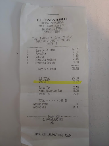 The place is clean but, the way they clean the tables is unsanitary. I saw a server cleaning the tables an she dumped the salsas and the curtido in to the same container with the dirty dishes. Of course you know they are going to use this bottles of salsa whit someone else. That was just for saving time on cleaning. After all she didn't wash her hands. Moreover, I got sick immediately after eating there. I believe was a bacteria on the water fontaine because I got this few years ago I can tell. Although I was a regular customer and I know that they included the tip automatically it's on the bill but now every time you ask for the bill, they just told the total amount but never in paper. I went to the cashier in order to have my bill and she do the same thing. I have always asked and never gotten. So, conclusion you can go places like El carbonero, Melita's, Los pipiles etc. To enjoy the same food but...