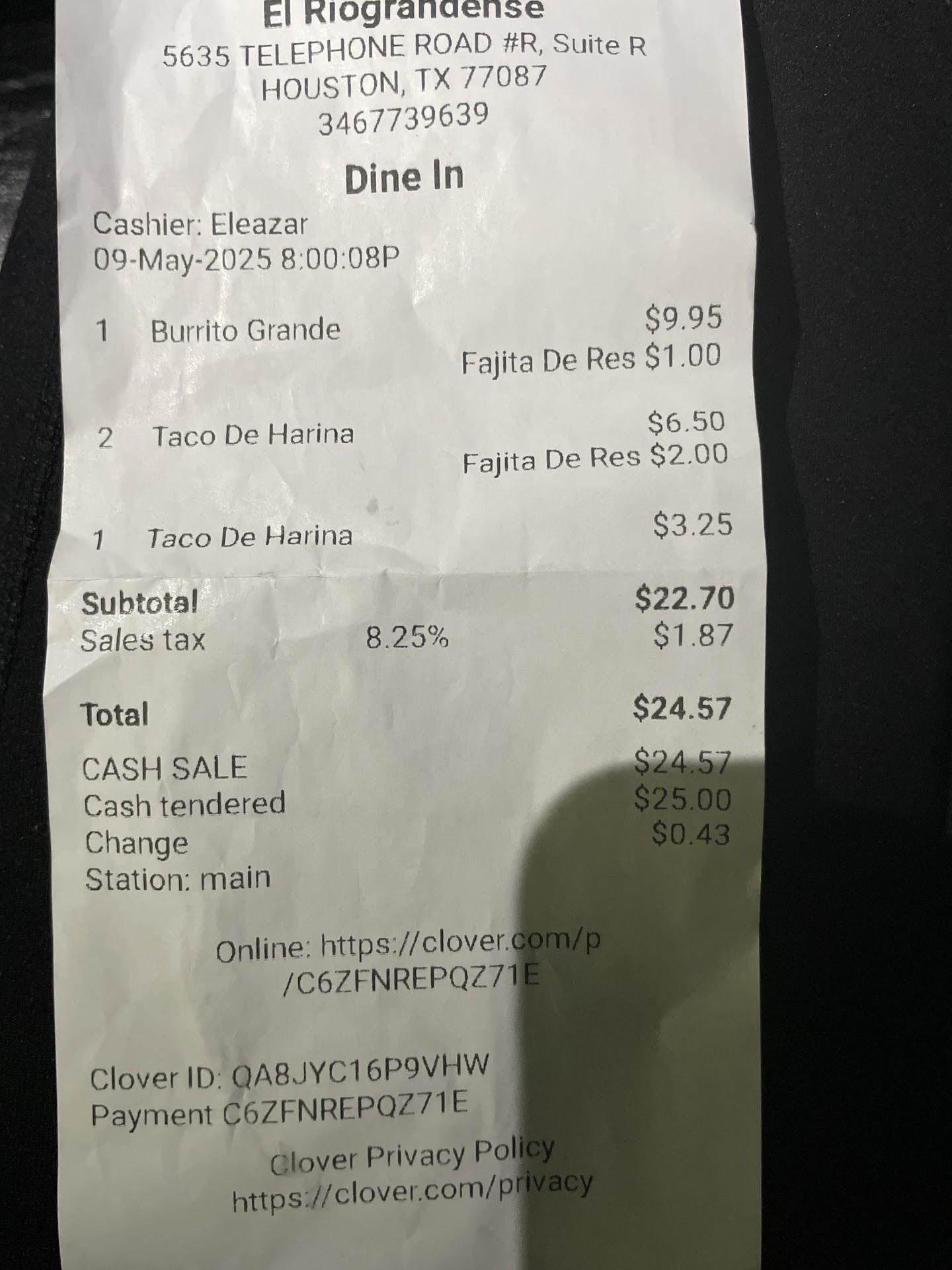 Read moreI been to this restaurant before I have nerve gotten charged extra dollar for fajita. The burrito comes with a meat off choice and same for the 2 fajita tacos I got charger 2 dollars extra. I dint ask for extra meat. I did look over the menu I didn’t see that they charge dollar more for fajita. I asked the guy why i got charged extra he said when you order anything with fajita beef they...