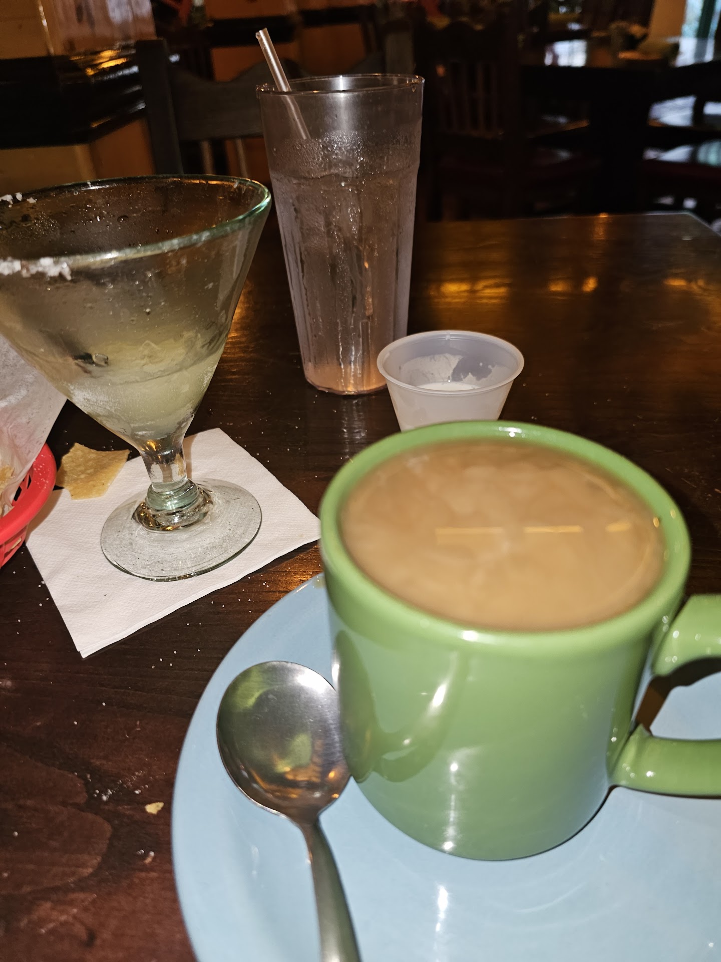 Read moreFood: so disappointed. The queso was good and the chips (although they were 90% broken) were crispy and thin, Green & red salsas were ok but nothing to praise. Refried beans were watery and bland (salt didn't help but the addition of the queso helped marginally). Suisa de la Ninfa with carnita filling was disappointing also, although some of the red salsa & salt helped. I'm not gonna even go there about the rice concoction. It was so bad that I couldn't even guess what the ingredients were. Coffee was okay but insipid Margarita was strangely bitter, but not in a good way. Sopapilla was too thick and again flavorless. The honey was okay but processed & thinned with water straight out of the bottle. I can't even describe the chocolate... ganache? It had an unusual taste to it.